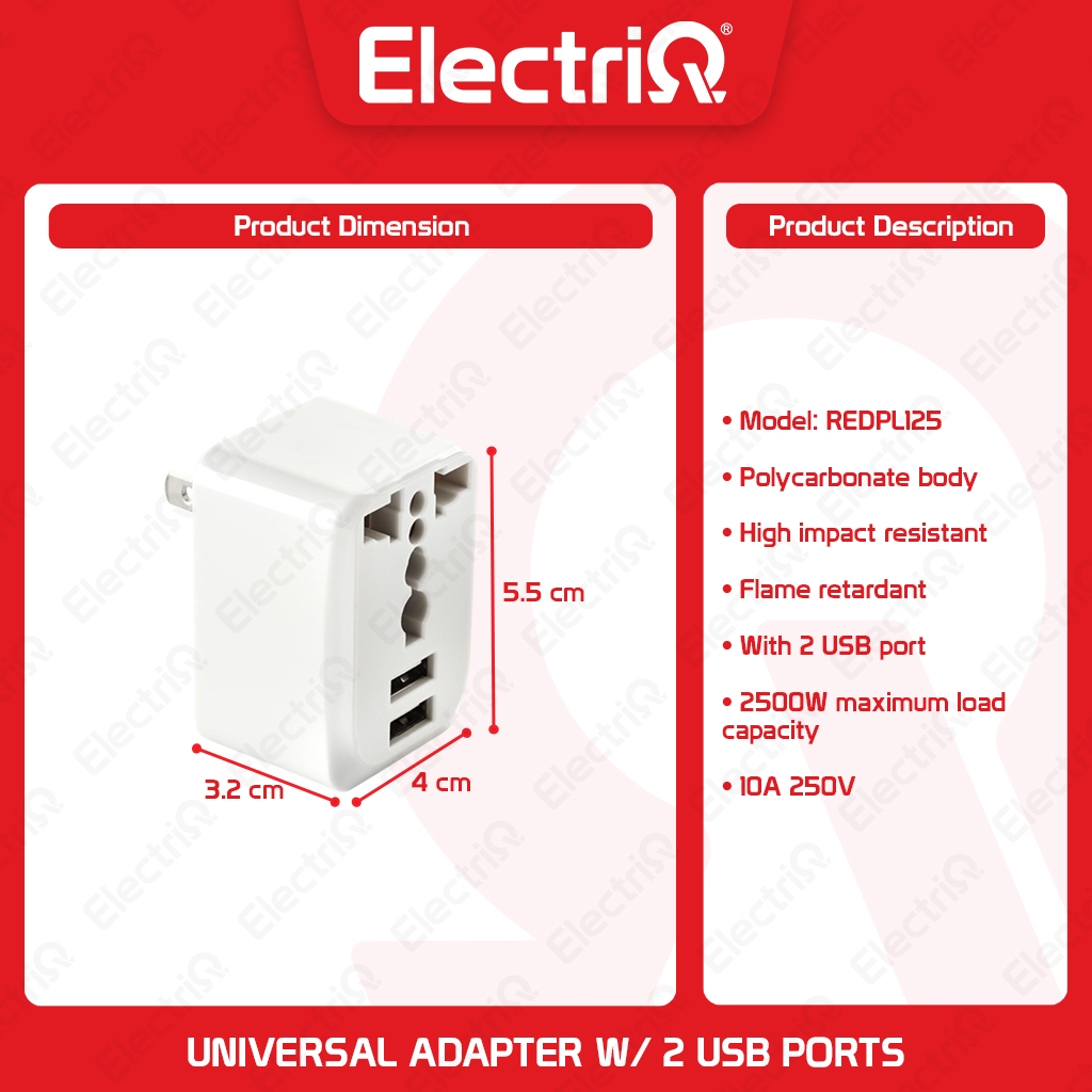 Electriq l Royu Universal Adapter Adaptor with 2 USB Ports Adapter Socket Adapter Plug REDPL125
