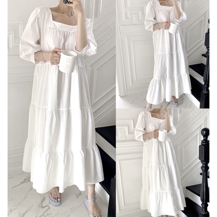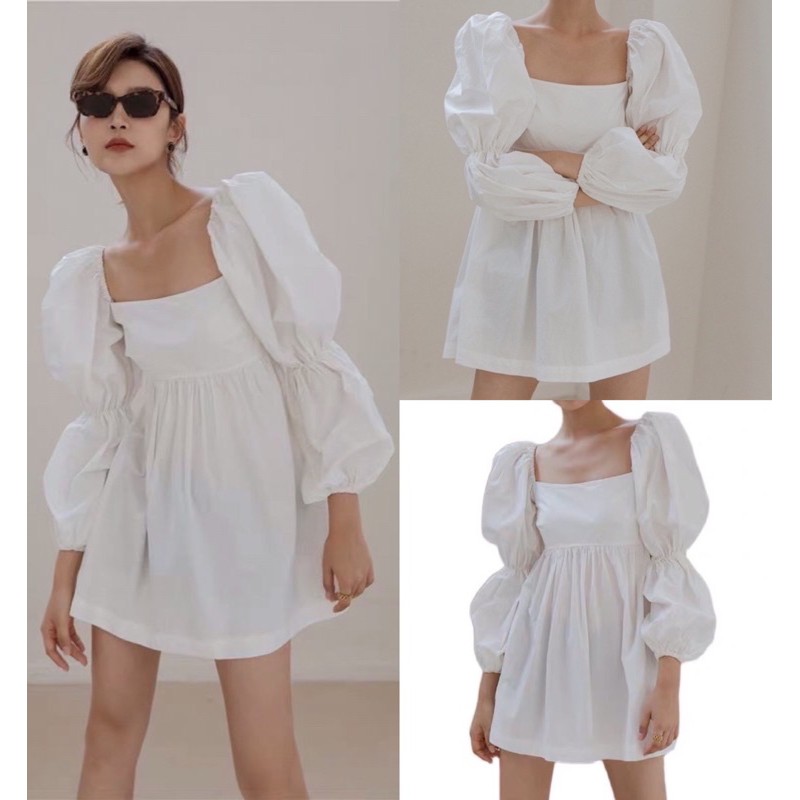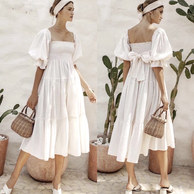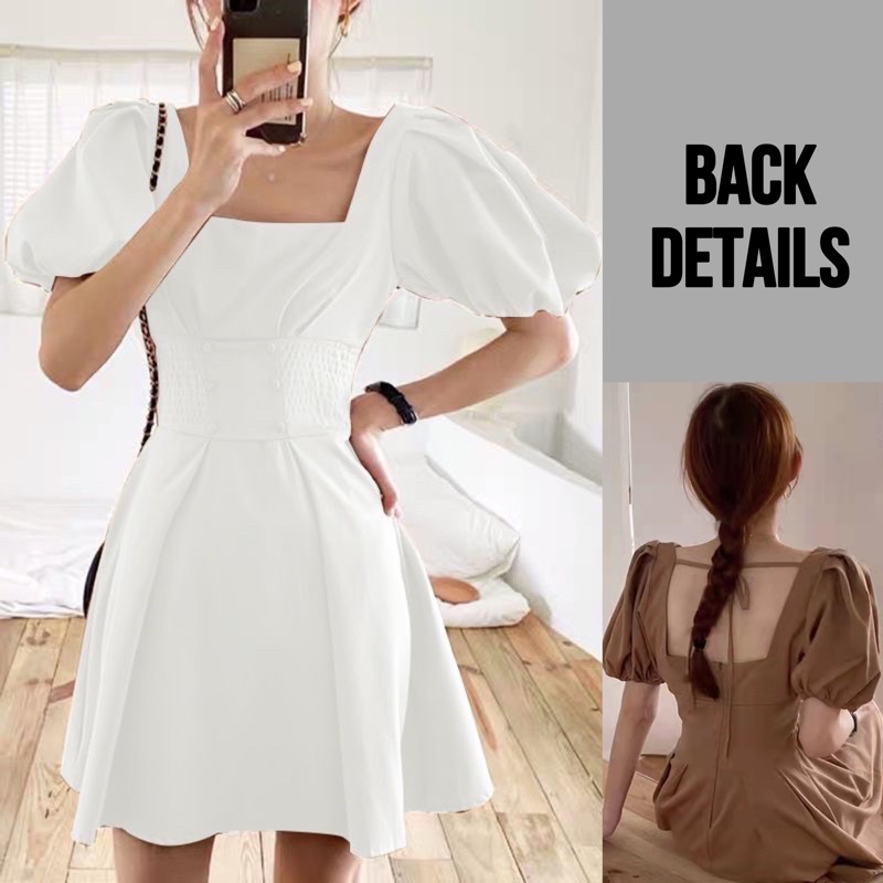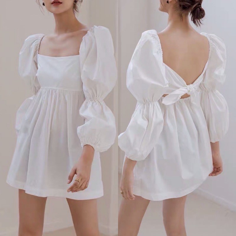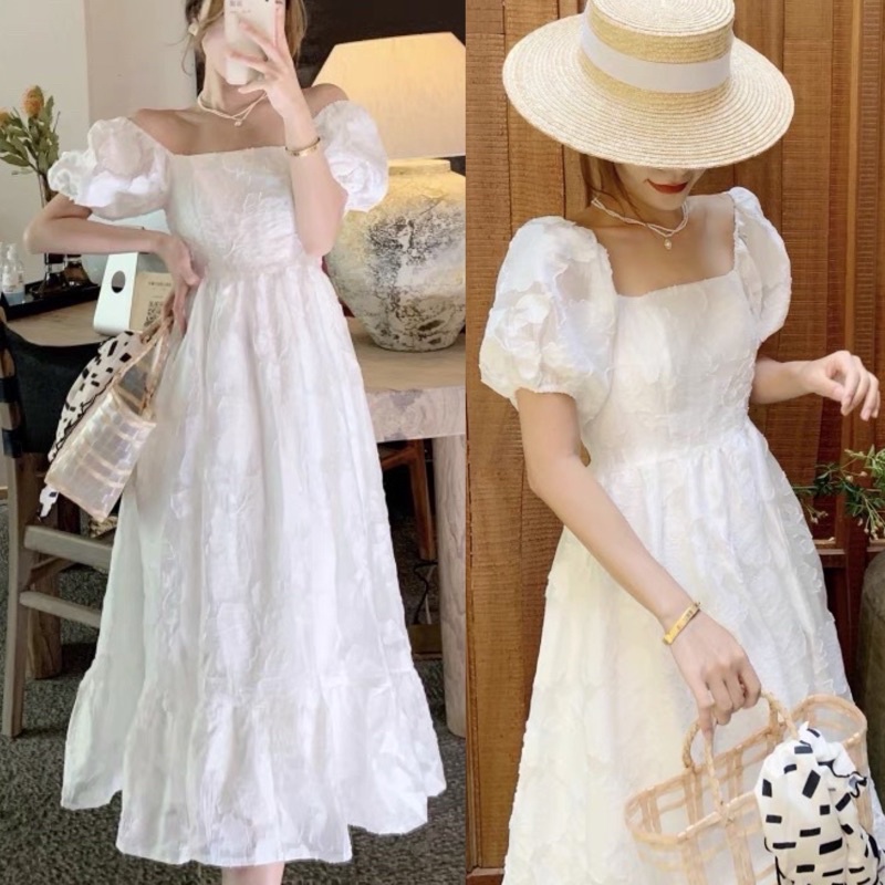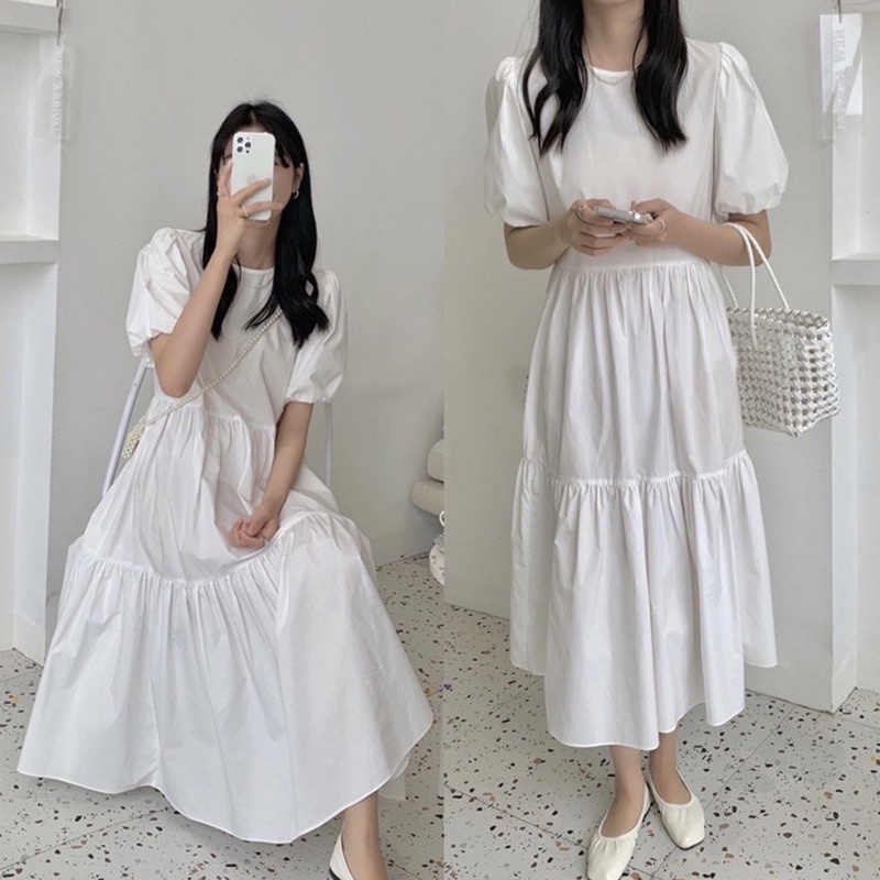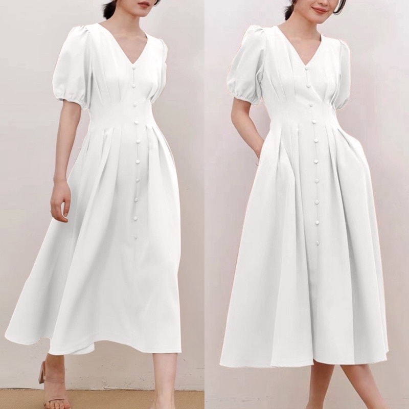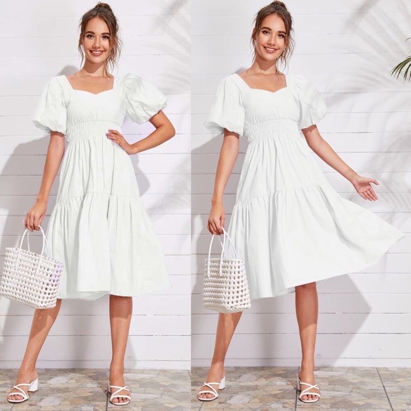 Elegant classy casual semi formal vintage puff sleeves white mini maxi dress