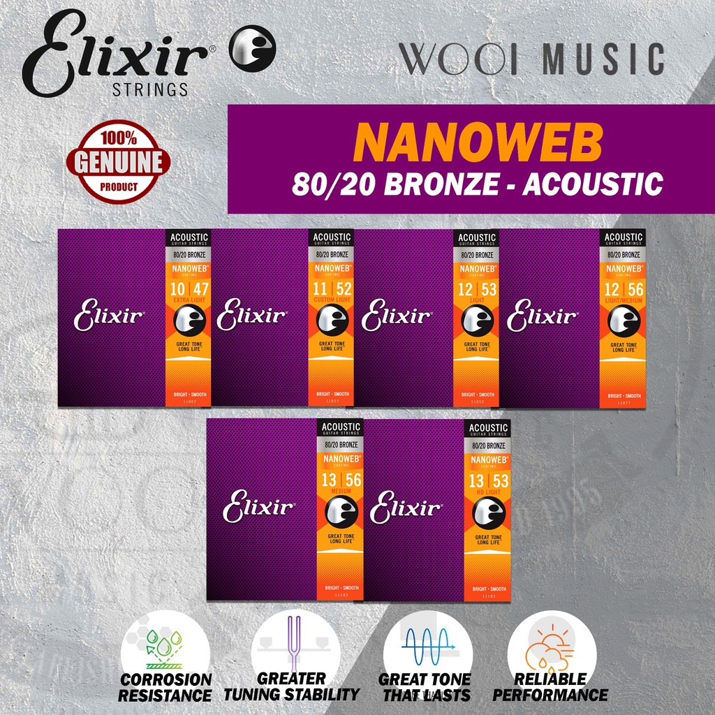 Elixir Nanoweb Acoustic Guitar Strings 80/20 Bronze - 11002 11027 11052 11077 (Gauges 10 11 12)