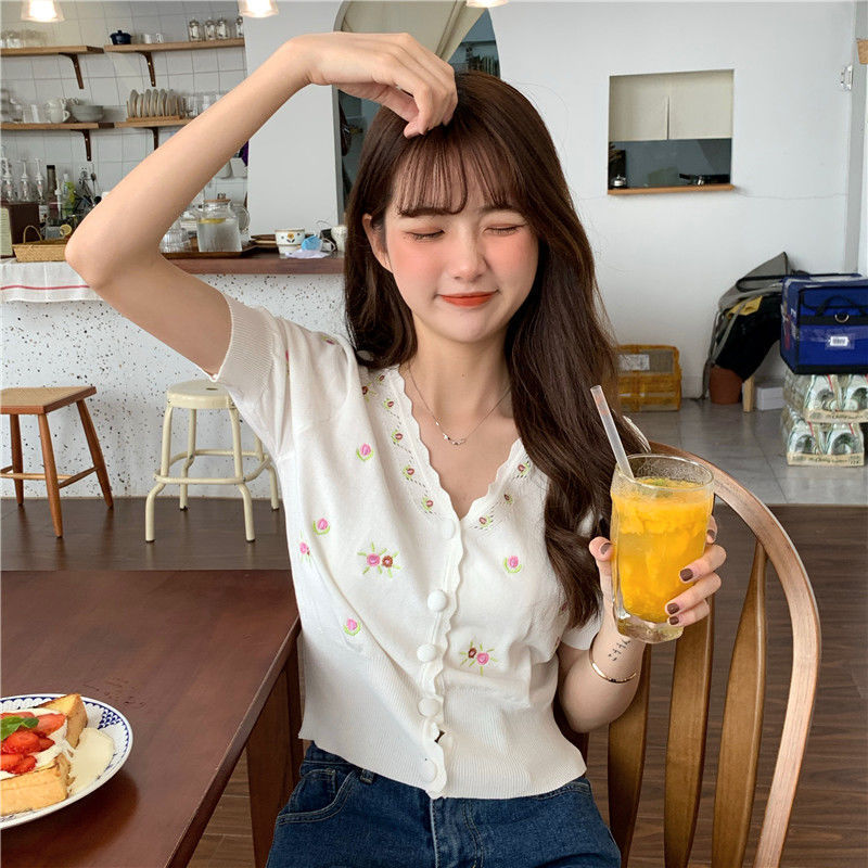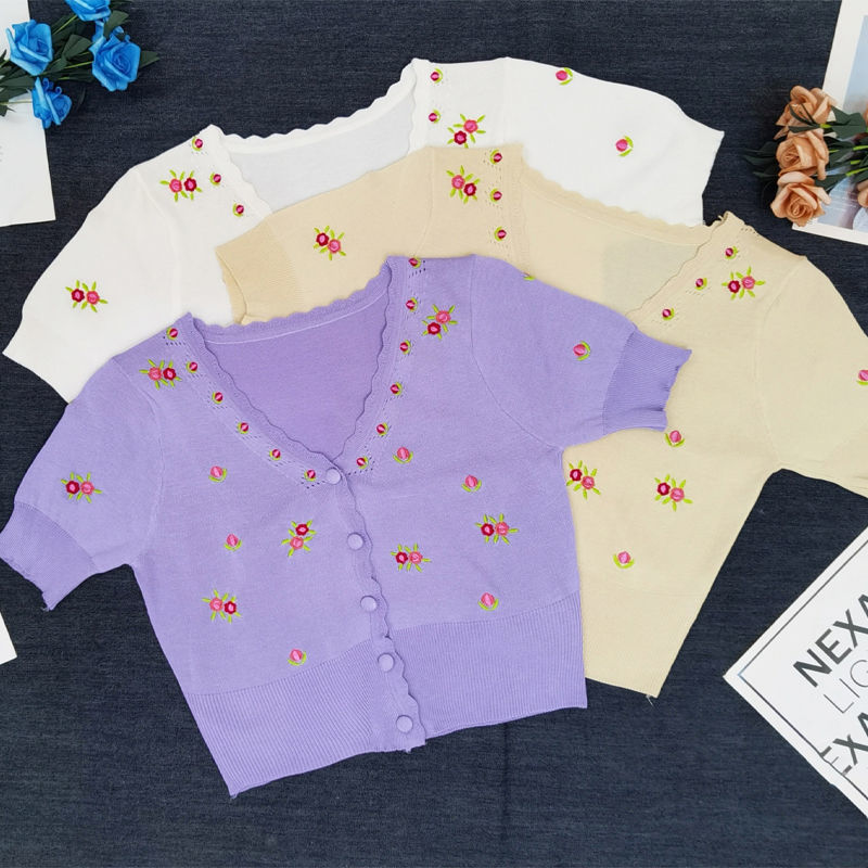 Korean Embroidered Flower Knitted Cardigan Short Sleeve Crop Top