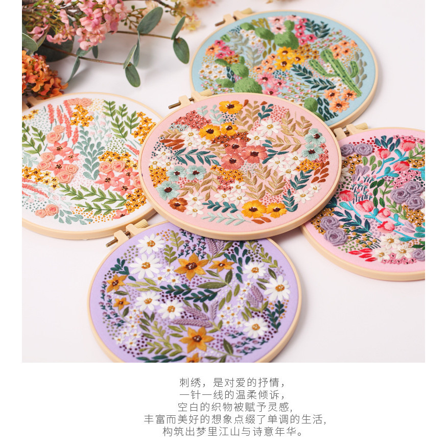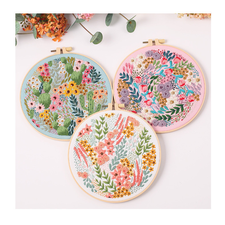 Embroidery kit, Adult Embroidery Material Set with Cute Flowers and Plants Patterns. Embroidery Clothes and Colors Threads.