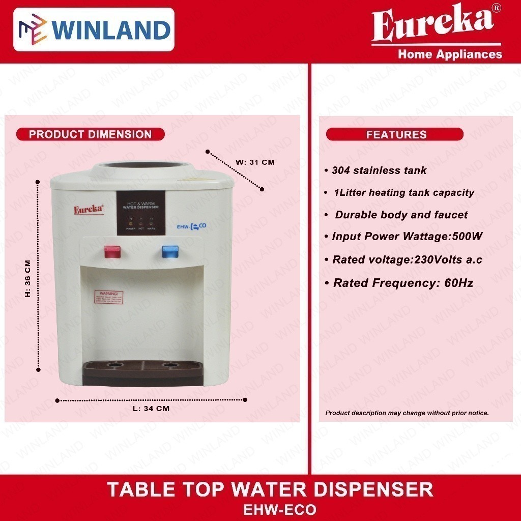 Eureka by Winland 1 Liter Hot and Warm Table Top Water Dispenser 500watts EHW-ECO