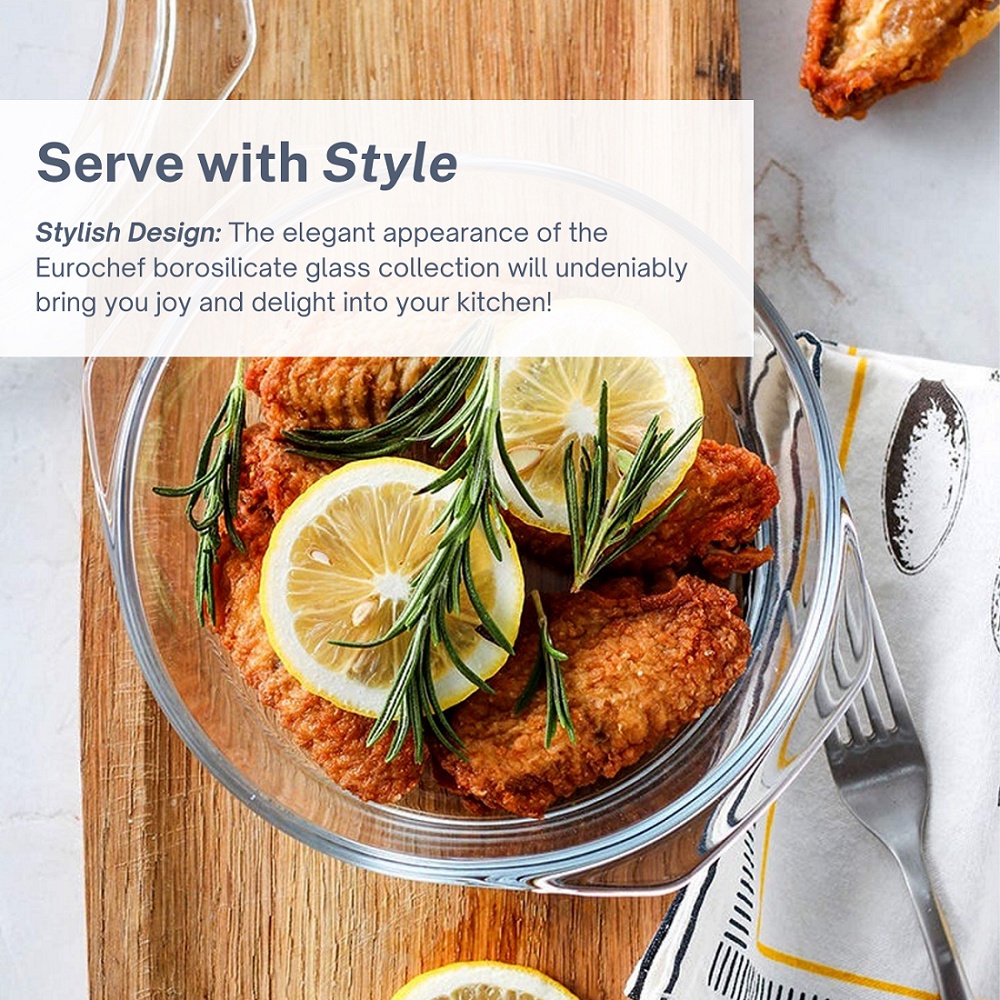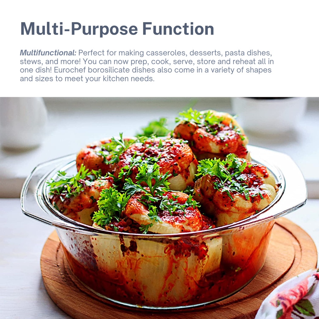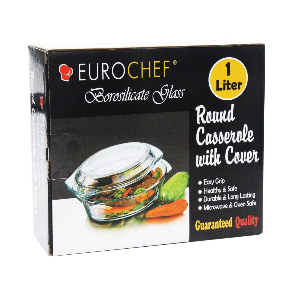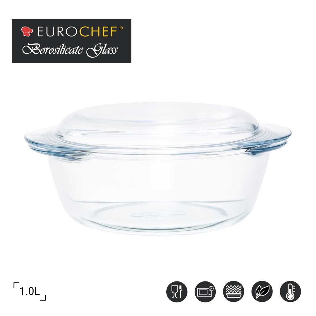 Eurochef BG010 Round Borosilicate Glass Baking Dish 1L Bake Tray Casserole with Cover Lid Handles