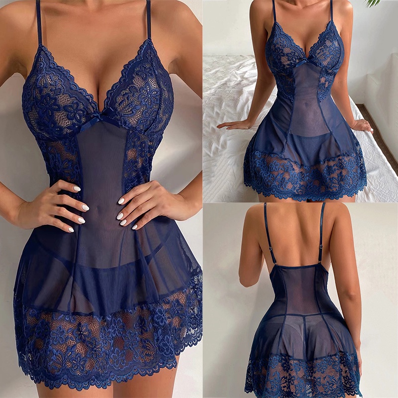 Exotic Floral Lace V-neck Strap Night Dress Set Women Sexy Lace Lingerie Nightgown Set Babydoll Sleepwear