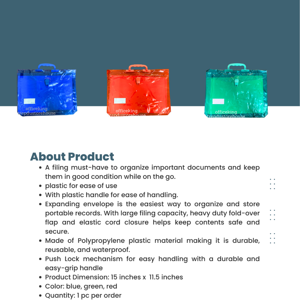 Expanding plastic envelope pushlock with handle blue, green, red long