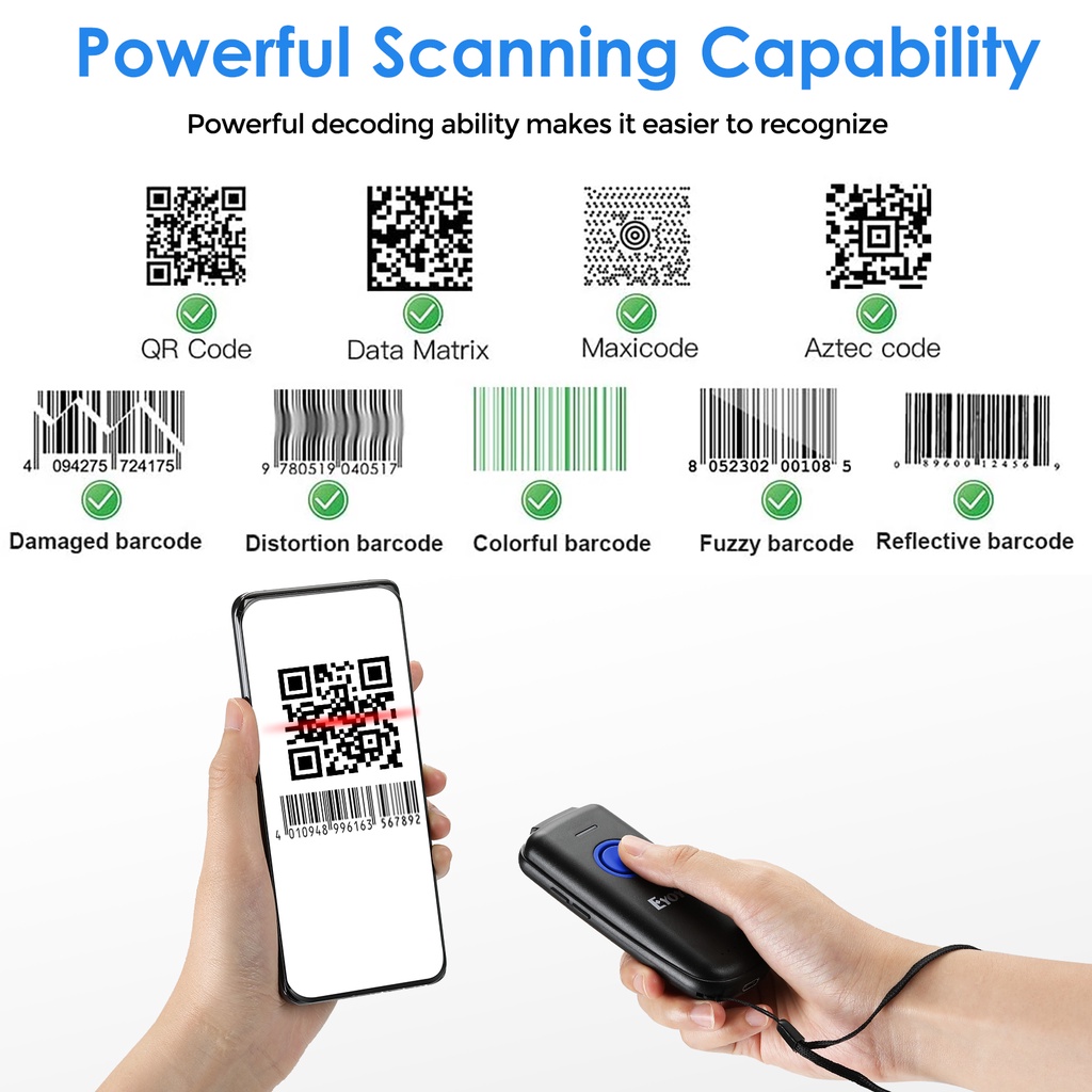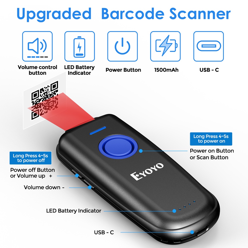 Eyoyo EY-023 Portable Bluetooth 1D/2D QR Code Scanner, with Volume Adjust Button and Physical Power Switch, For Tablet Smartphone Computers