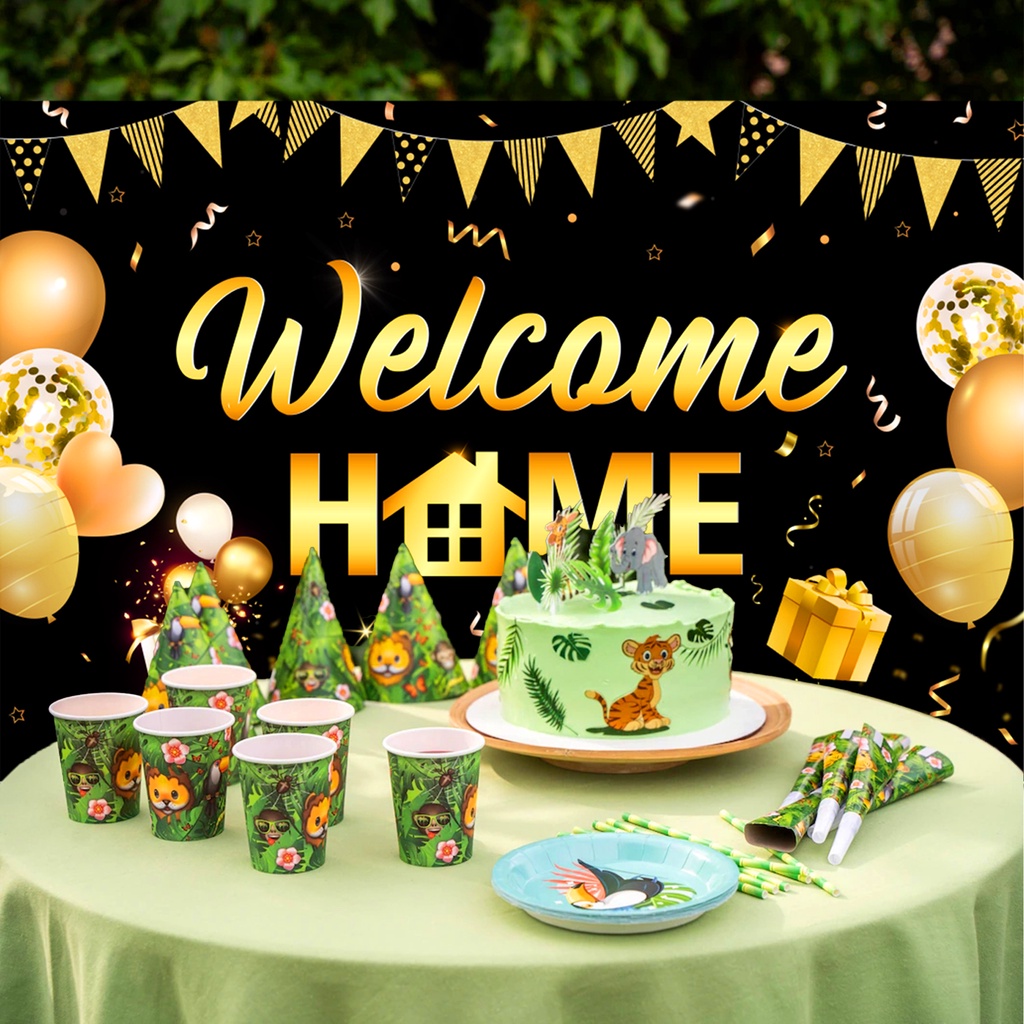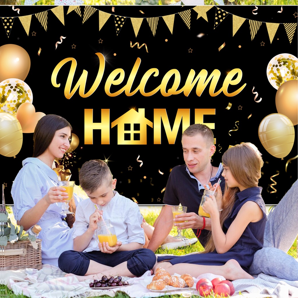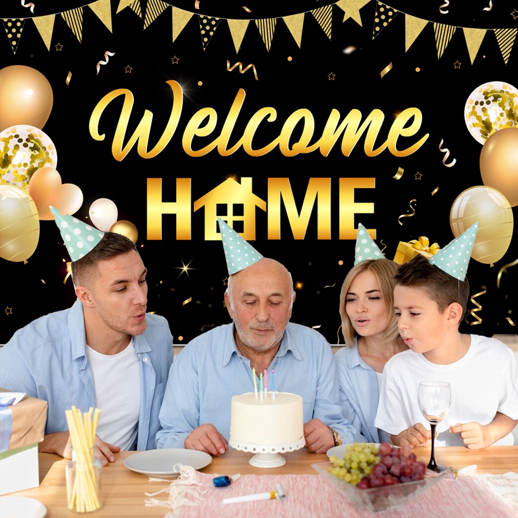 FANGLELAND Welcome Home Party Decorations Supplies Homecoming Party Backdrop Welcome Back Home Banner Photography Background for Family Party Home Decoration Photo Booth Black Gold