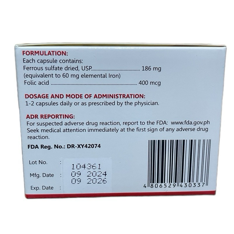 FERROUS SULFATE + FOLIC ACID (FERLUM PLUS) 186mg/400mcg 100 capsules HEMATINIC
