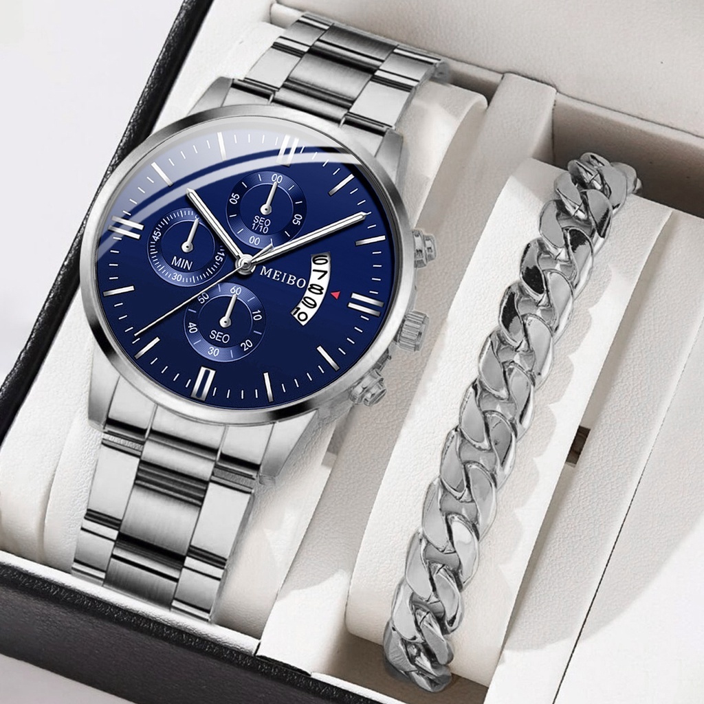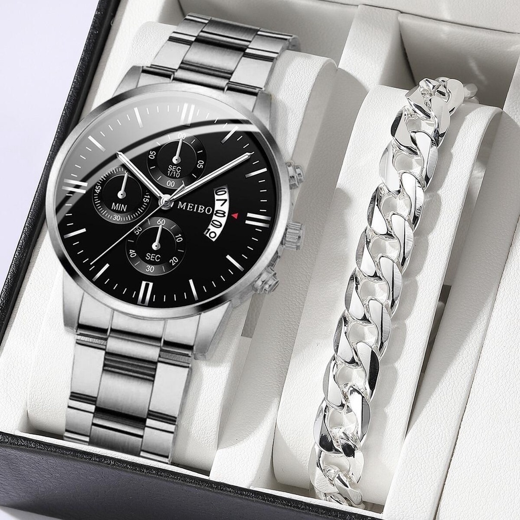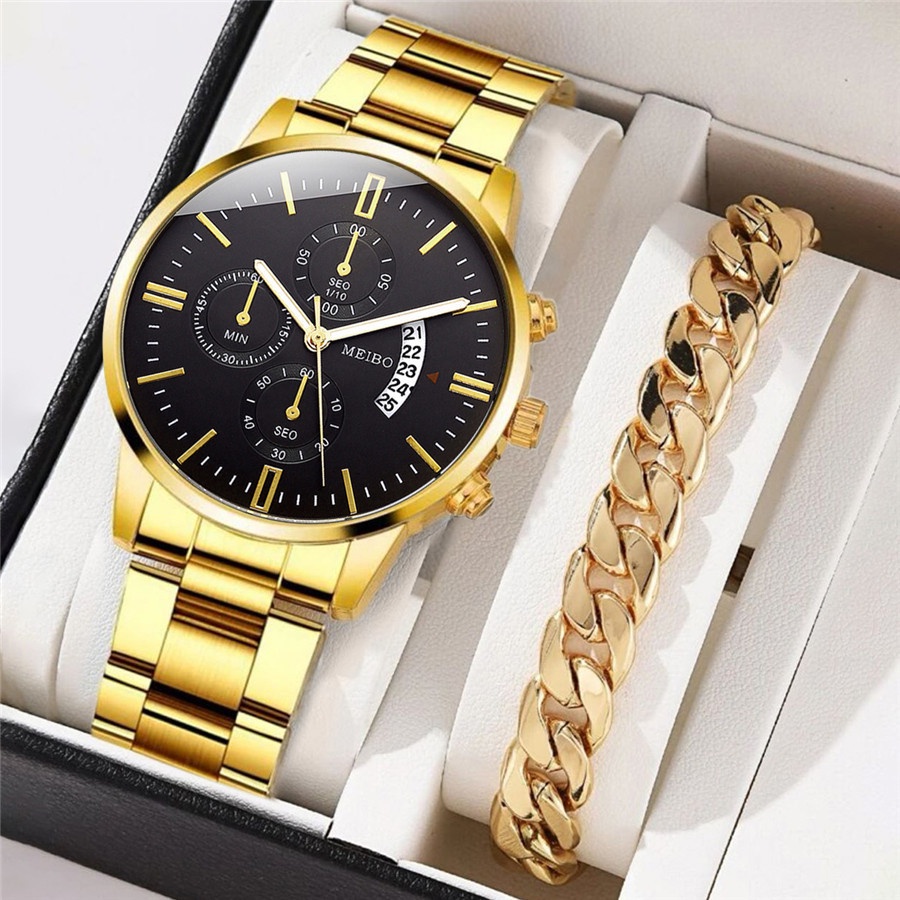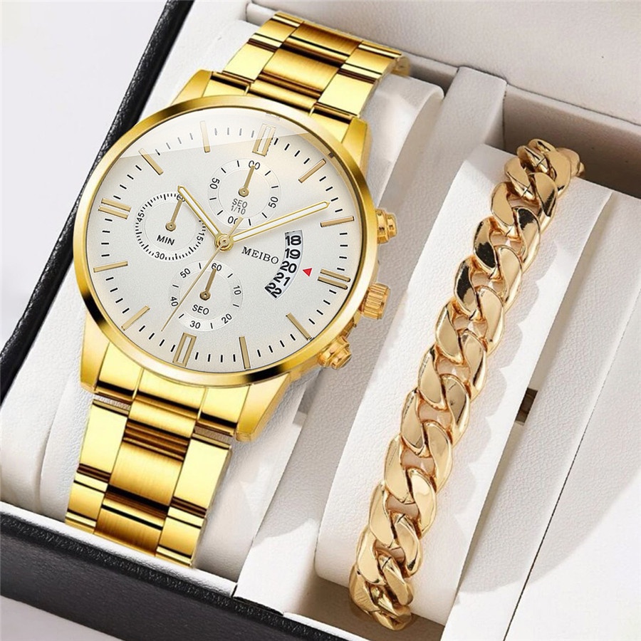 Fashion Men's Watches Bracelet Set Stainless Steel Band Man Silver Gold Quartz Watch Set