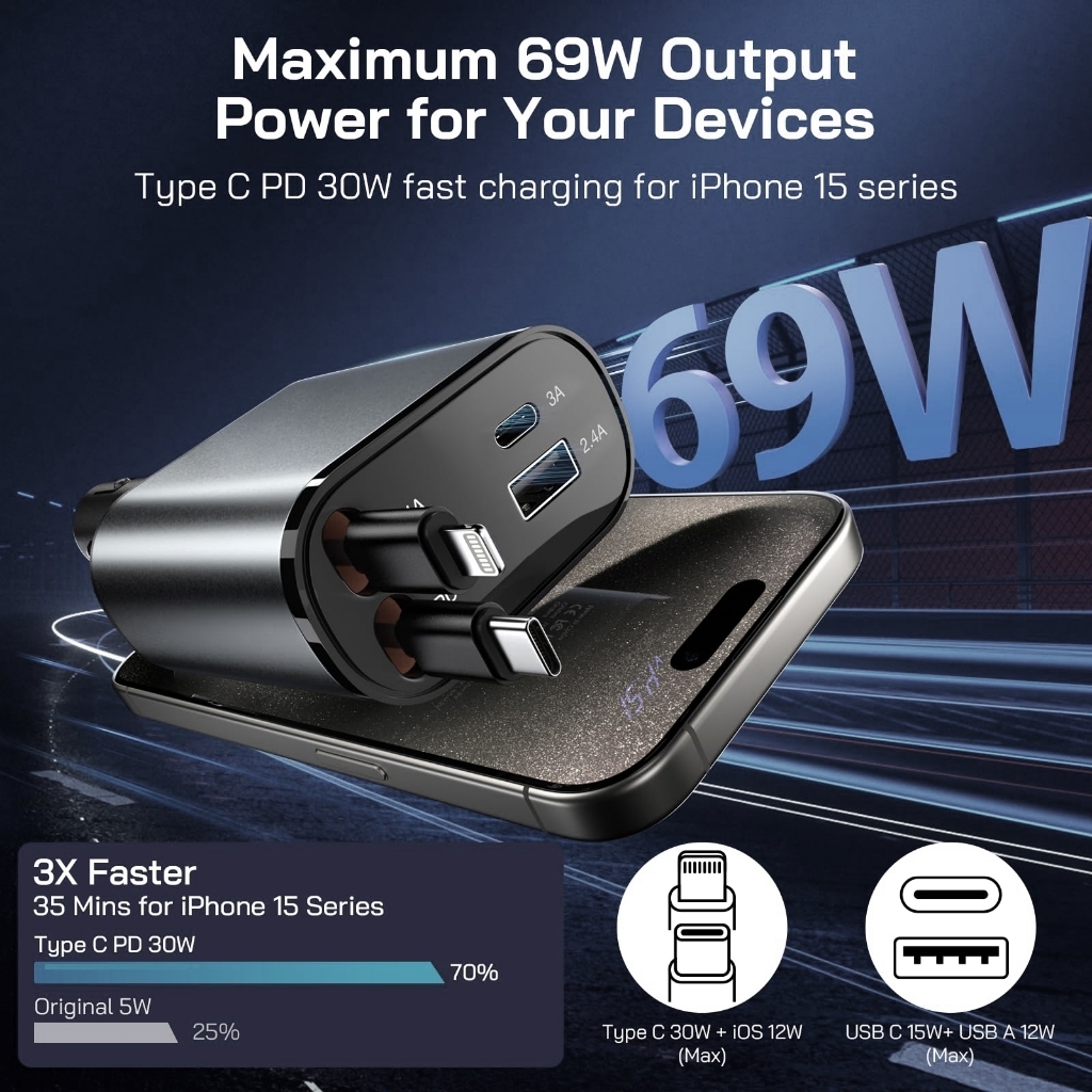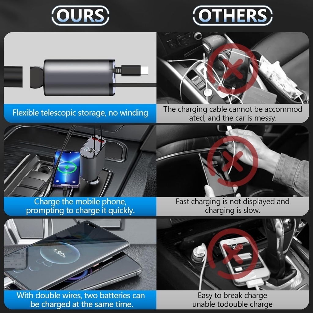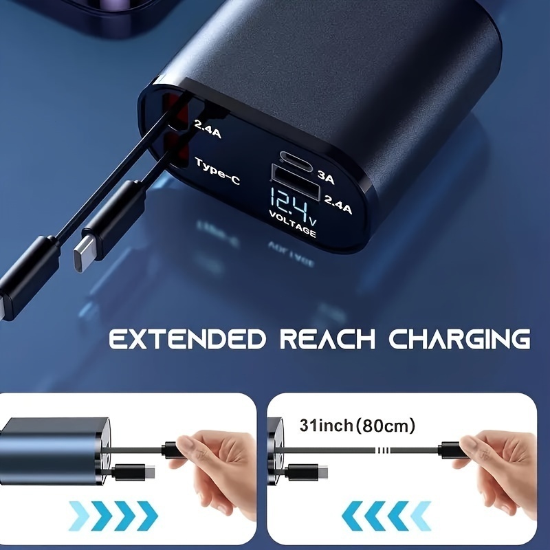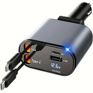 Fast Charging Retractable Fast Car Charger 4-In-1 Car Phone Charger Type-C And iOS with cable