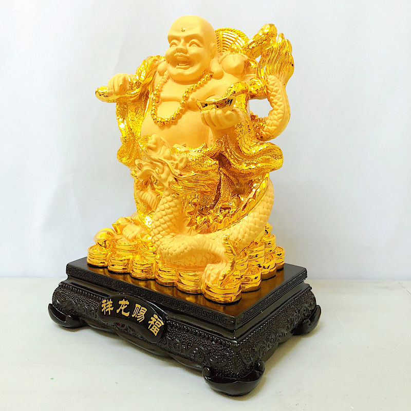 Fengshui Laughing Buddha Money Buddha Sitting On Dragon Chair Full of Wealth Coin Holding Money Bar