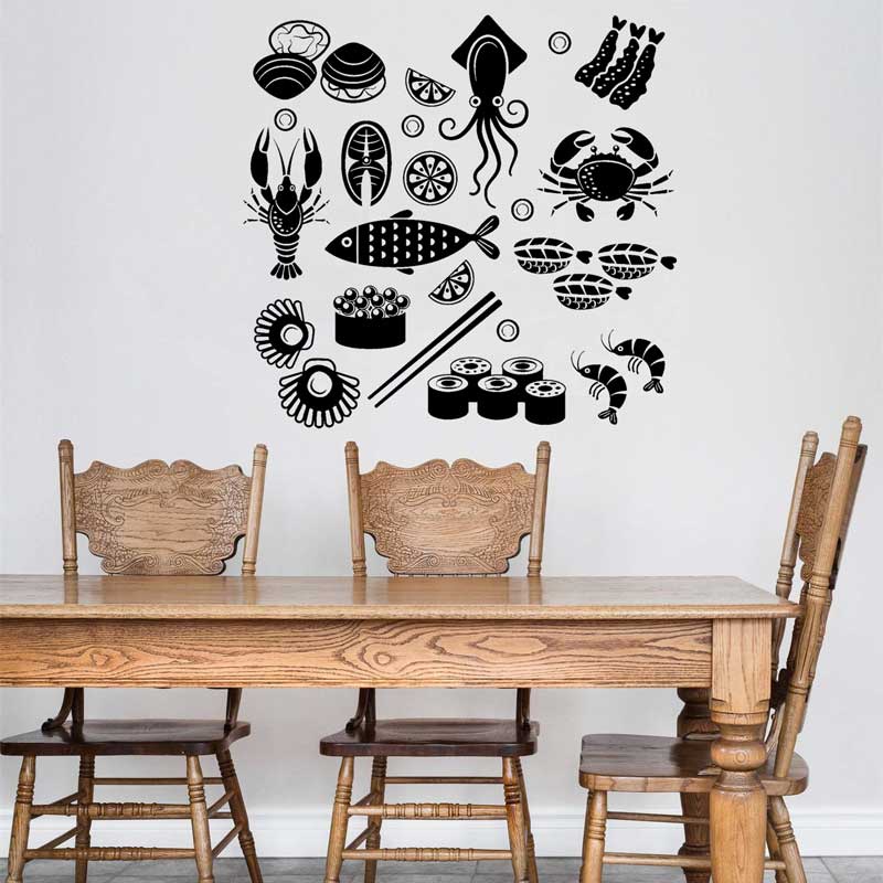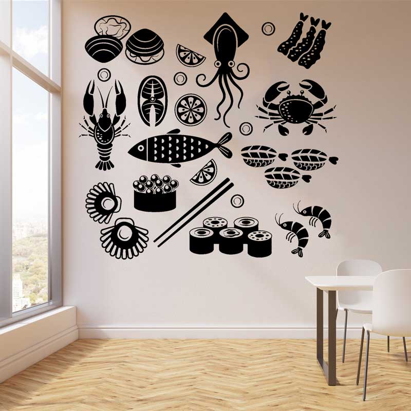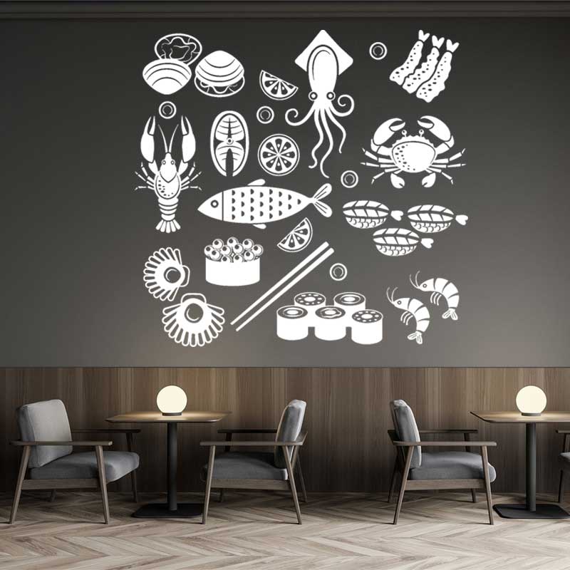 Fish Seafood Japanese Sushi Bar Restaurant Vinyl Wall Stickers Food Shop Door and Window Signboard Crab Shrimps Wall Decoration Sticker