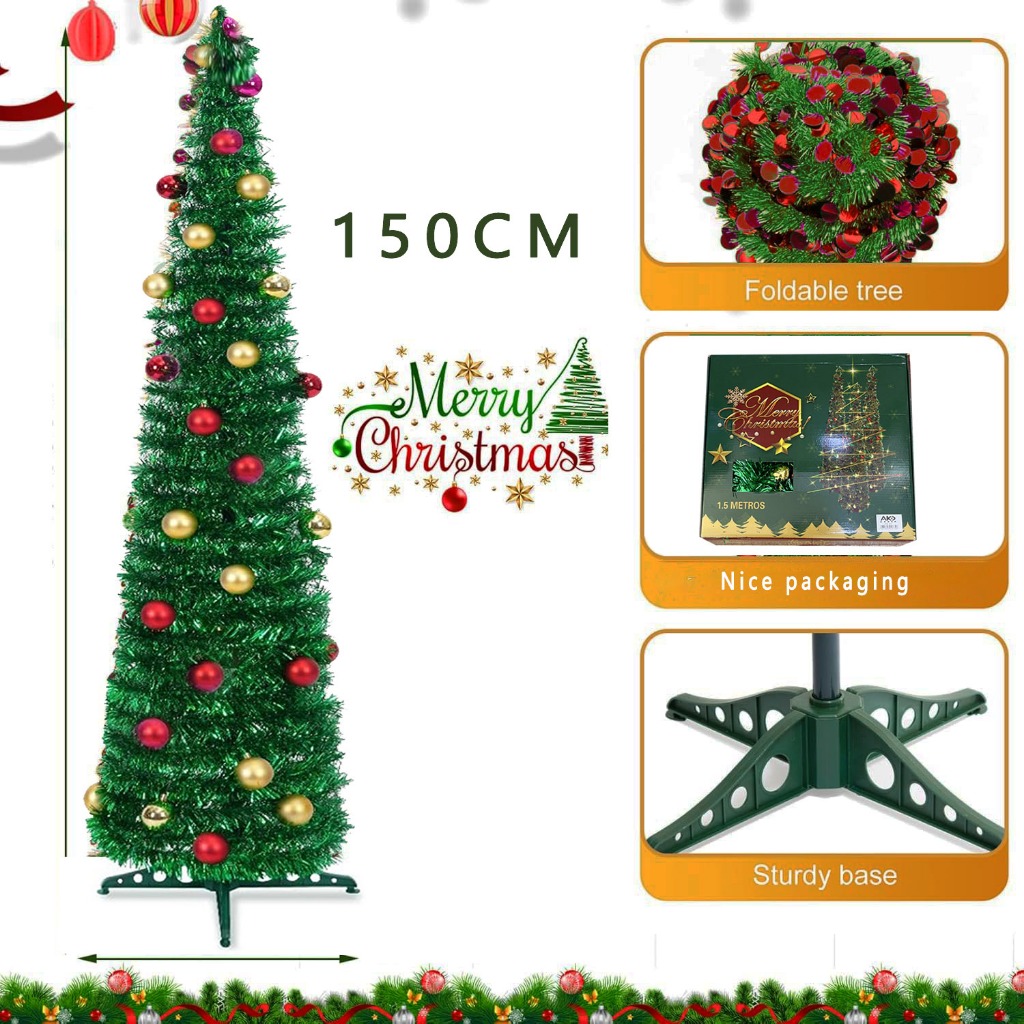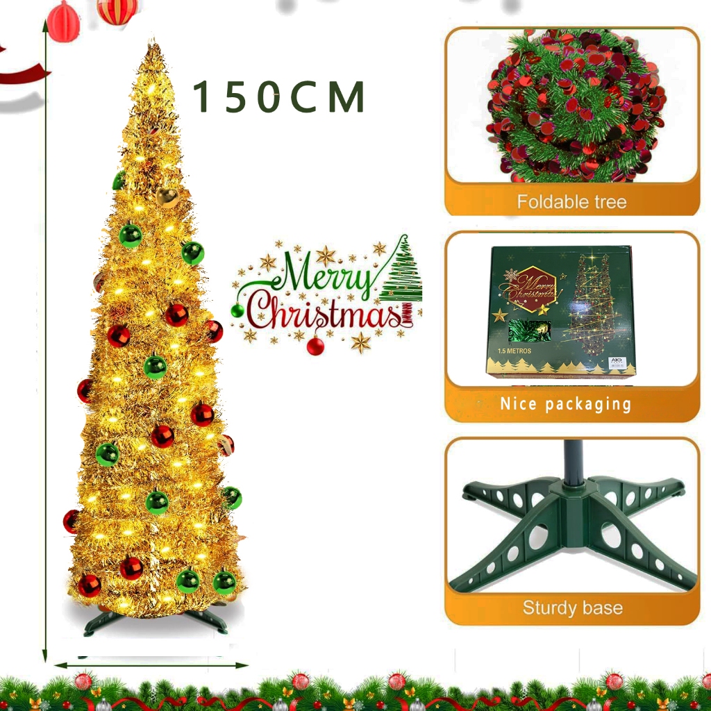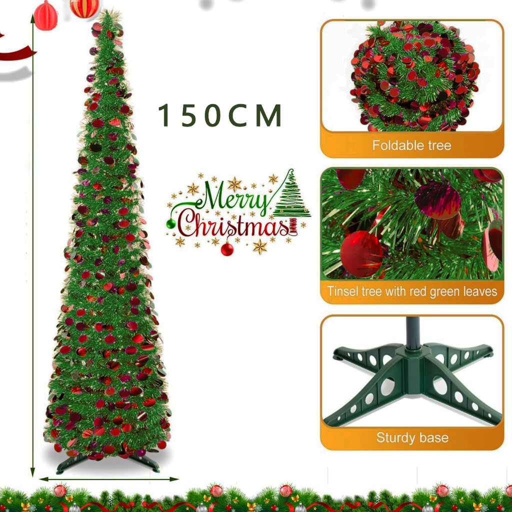 Foldable Christmas Tree Pop Up Artificial Tinsel Christmas Tree with Snowflake Ornaments 150cm