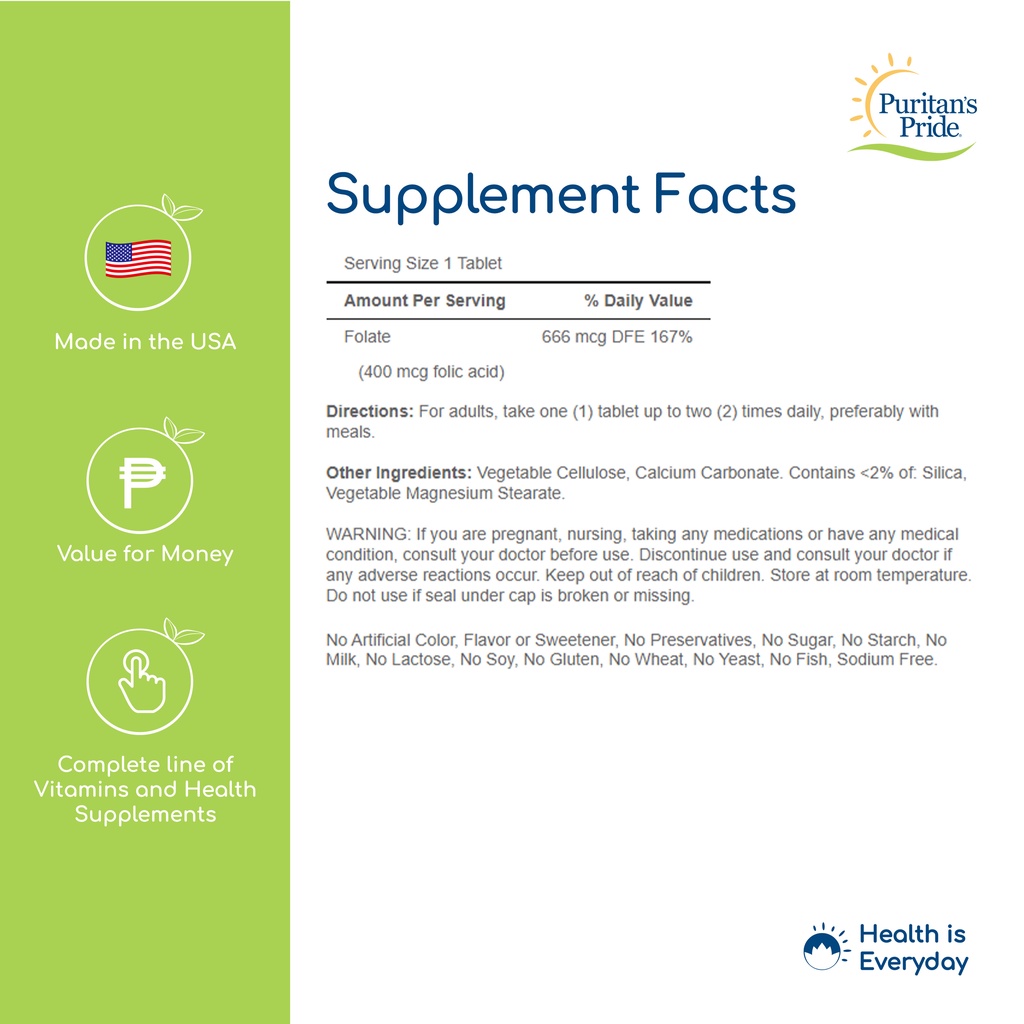 Folic Acid 400mcg 250 tablets Fertility Pregnancy Puritan's Pride