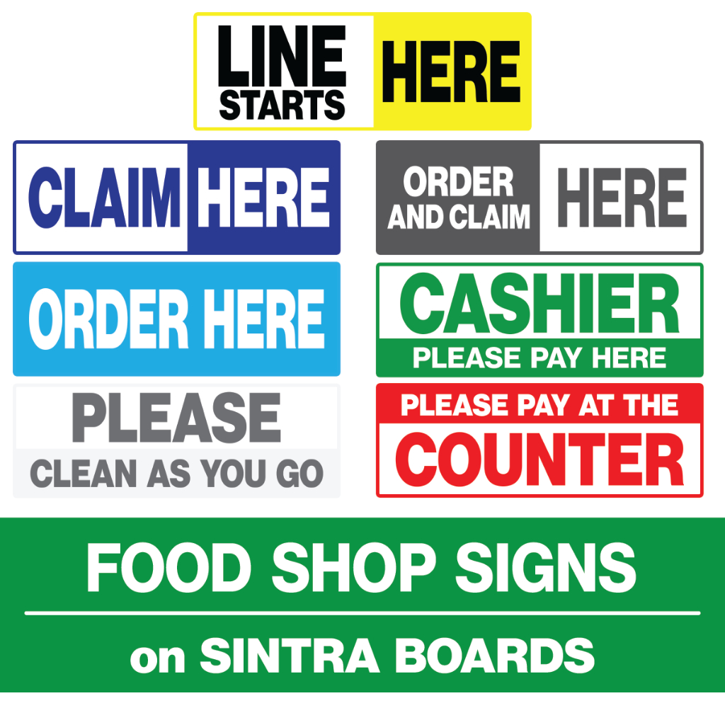 Food Shops, Milk Tea Shops and Fast Food Signages/ Cashier, Claim Here, Pay As You Order, Order Here