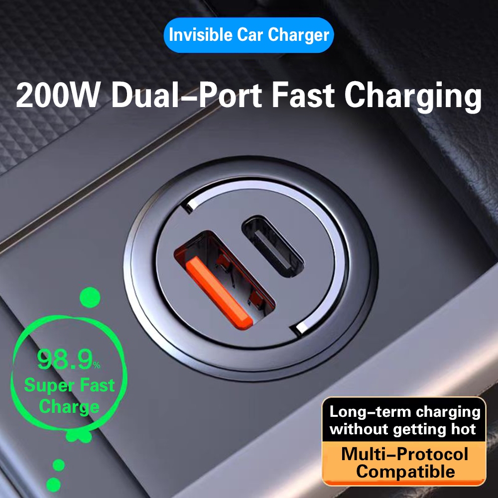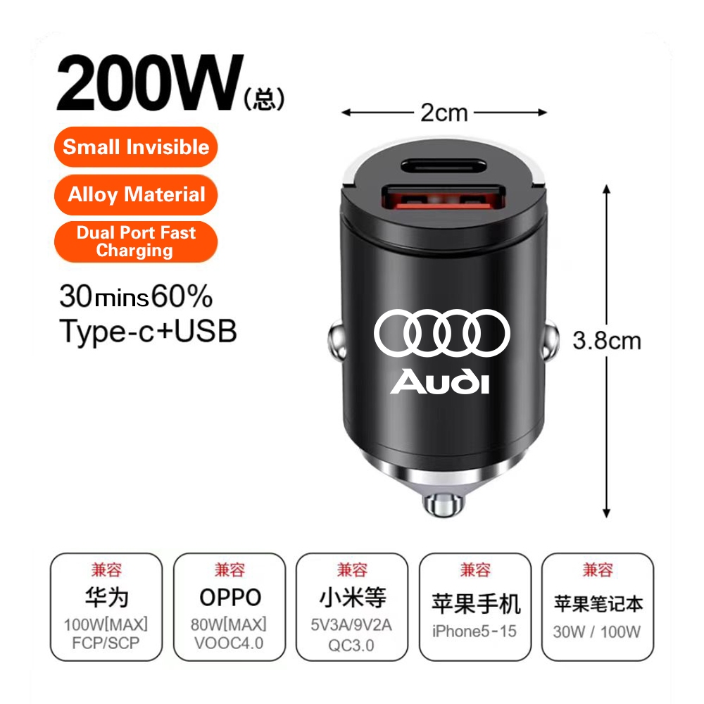 For AUDI Car Phone Quick Charger 200W Type C PD QC3.0 USB Dual Ports Fast Charging for A1 A3 A4 A5 A6 A7 A8 Q2 Q3 Q5 Q6 Q7 Q8 TT Car Cigarette lighter