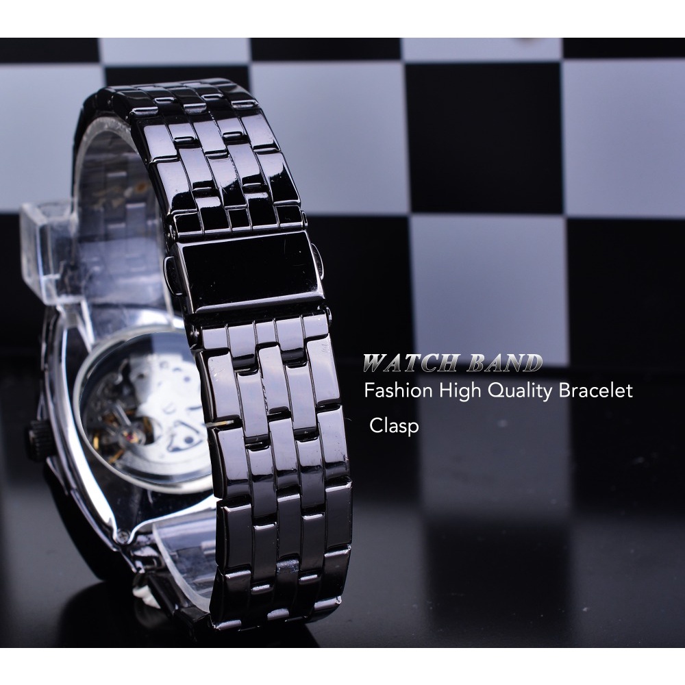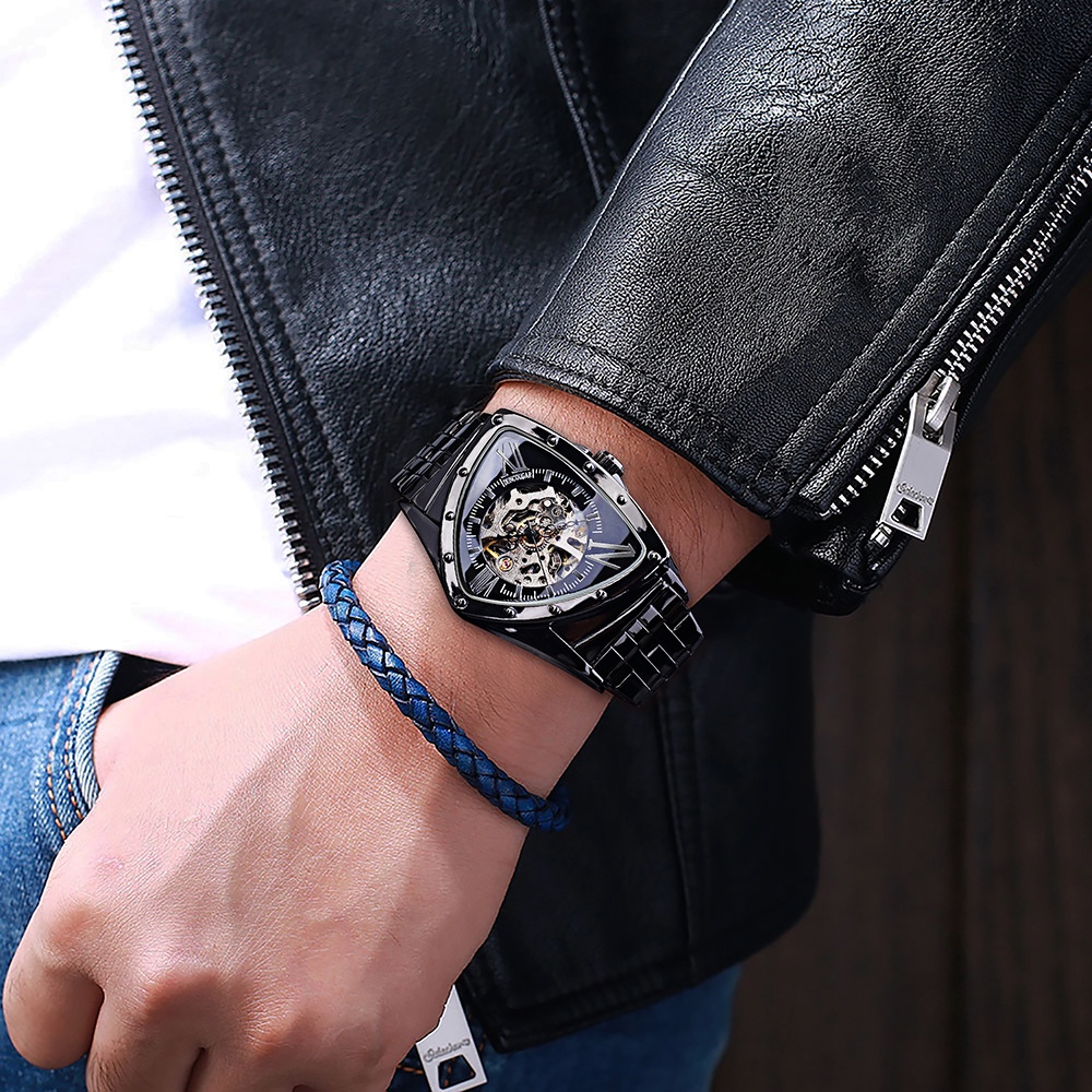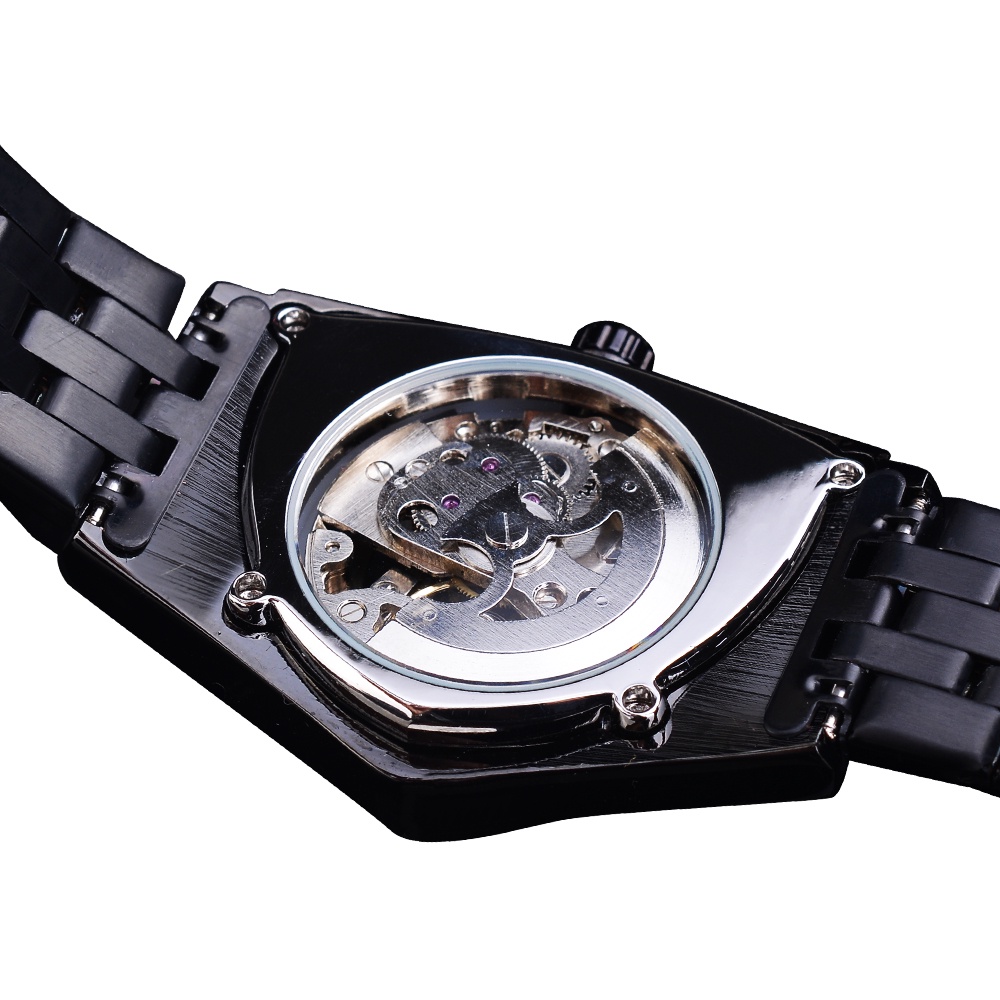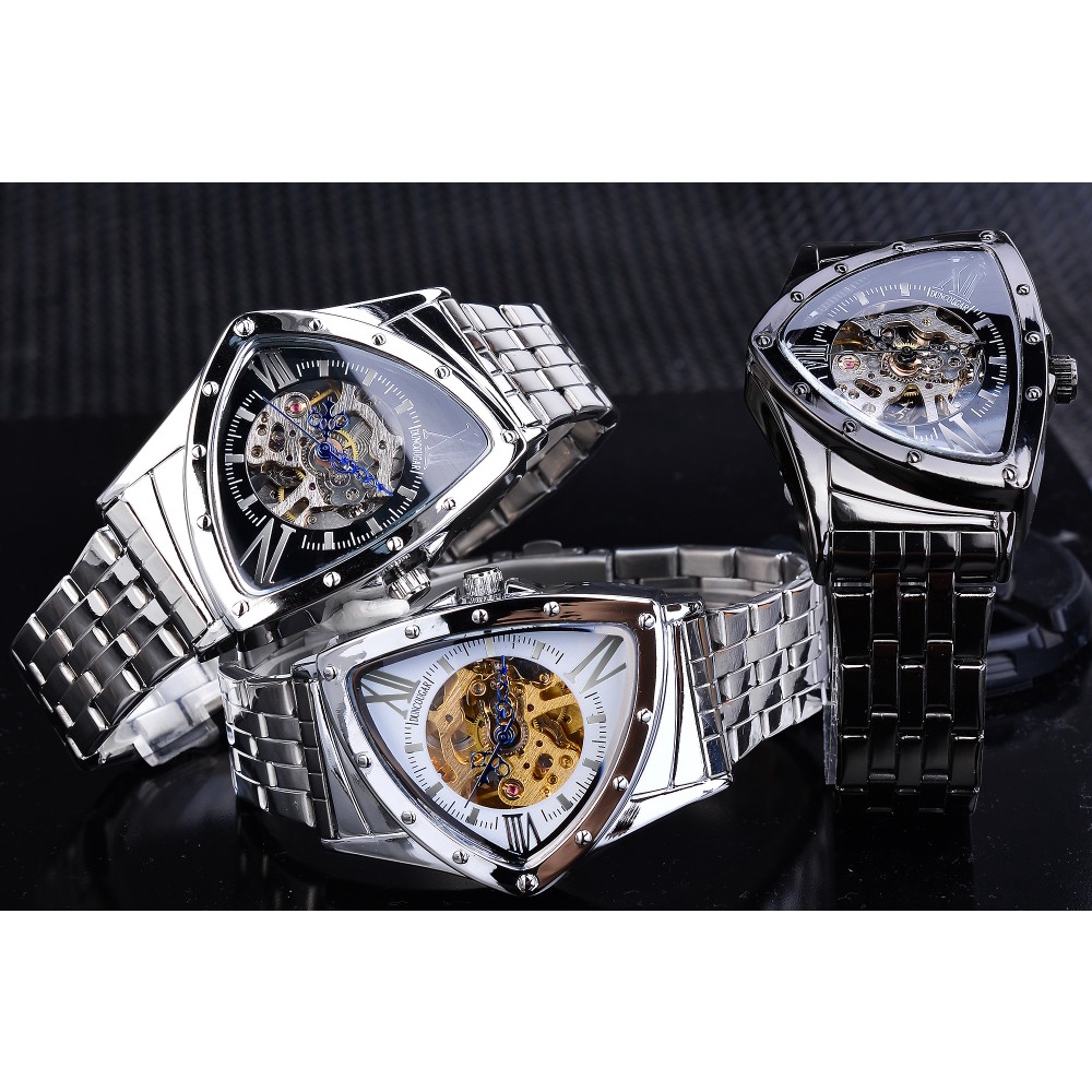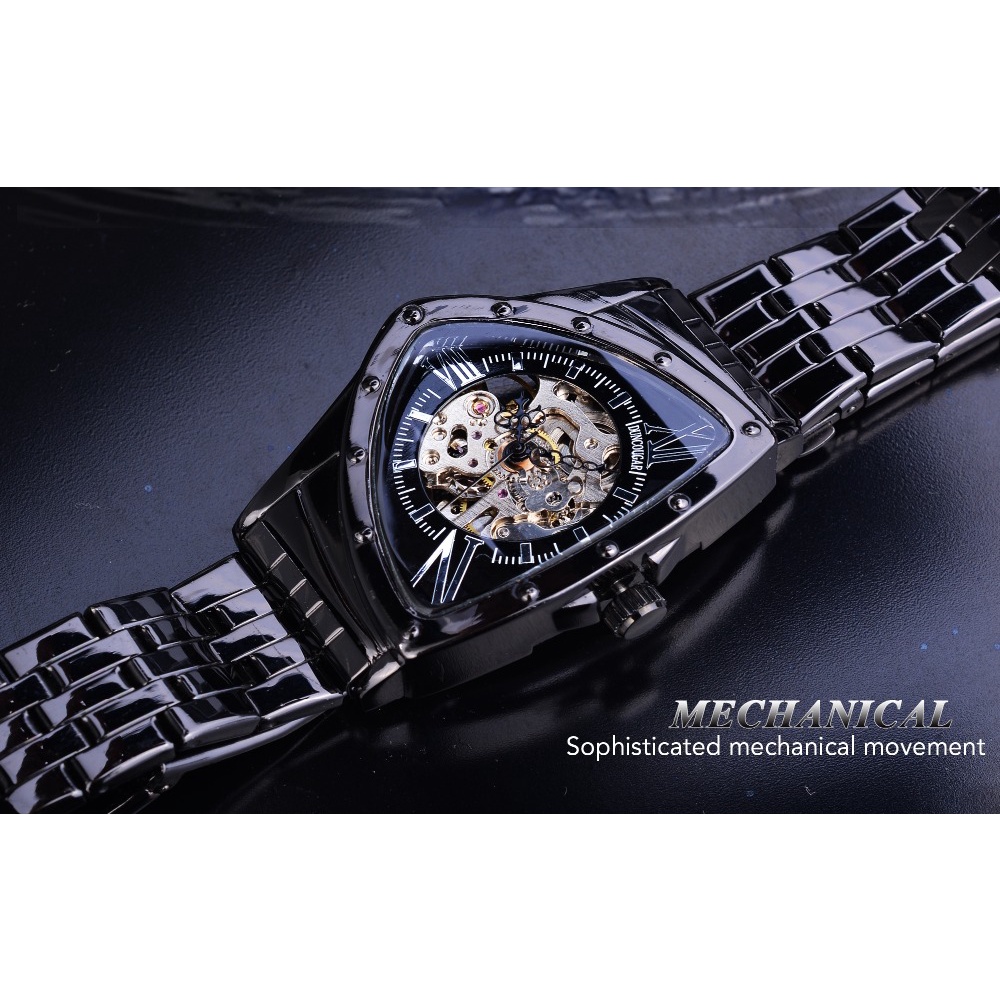 Forsining Triangle Skeleton Black Automatic Watch Stainless Steel Men Business Sport Irregular Mechanical Wristwatch