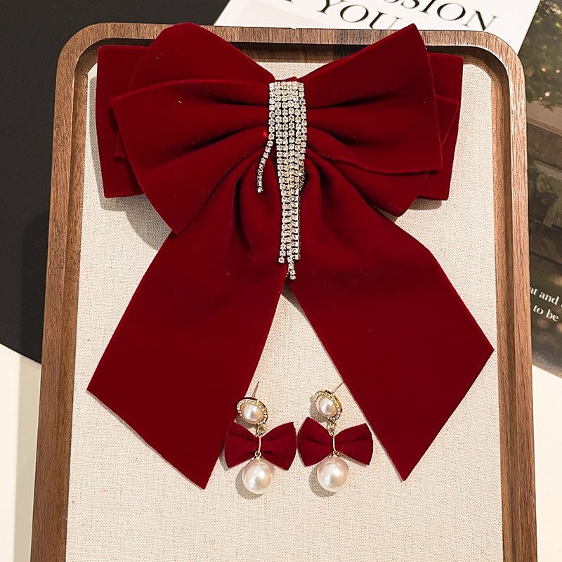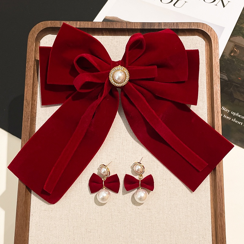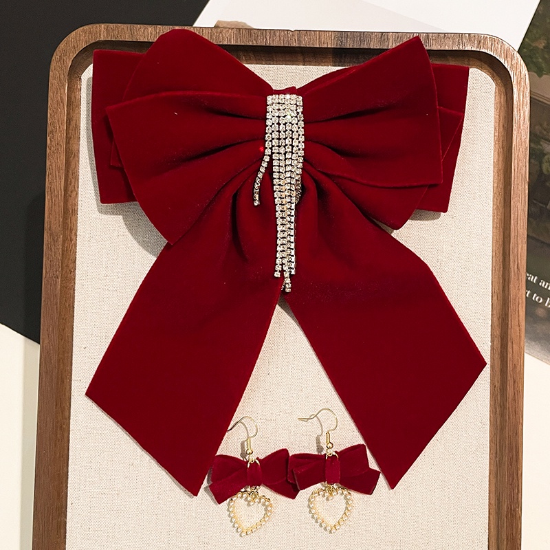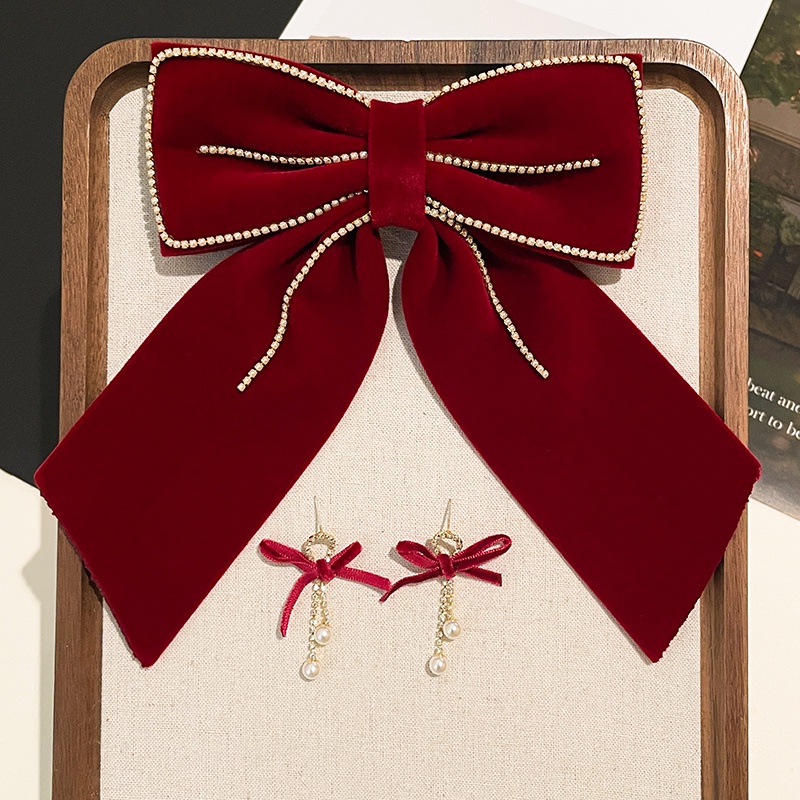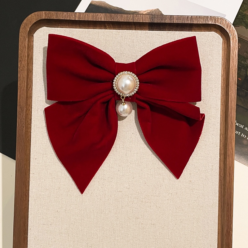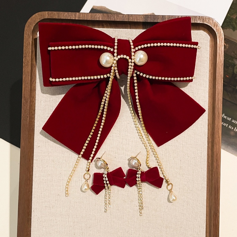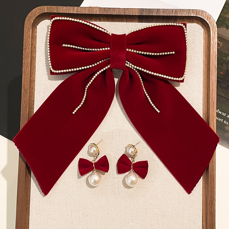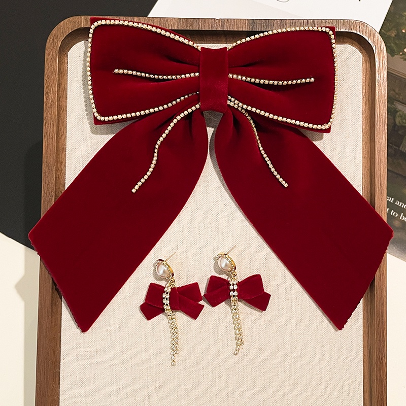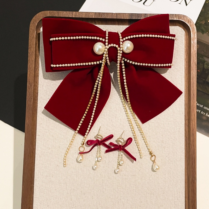 French Retro Red Velvet Large Bow Hair Clip Luxury High Quality Pearl Shiny Rhinestone Bridal Wedding Hairpin Temperament Headgear Gift