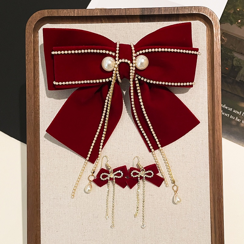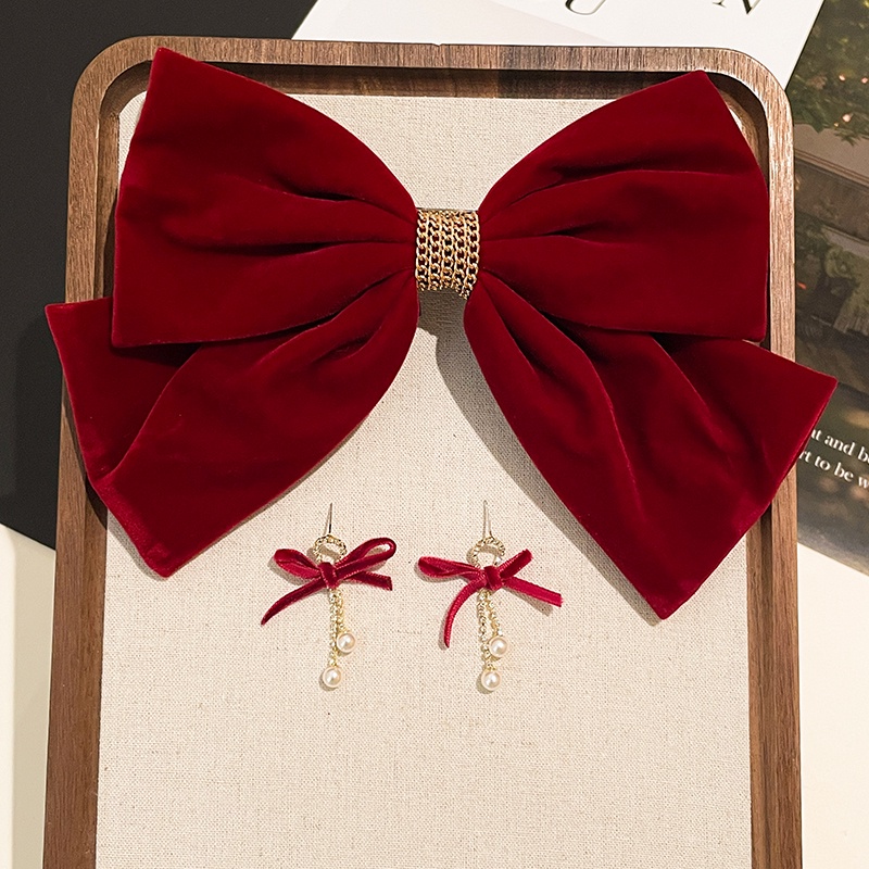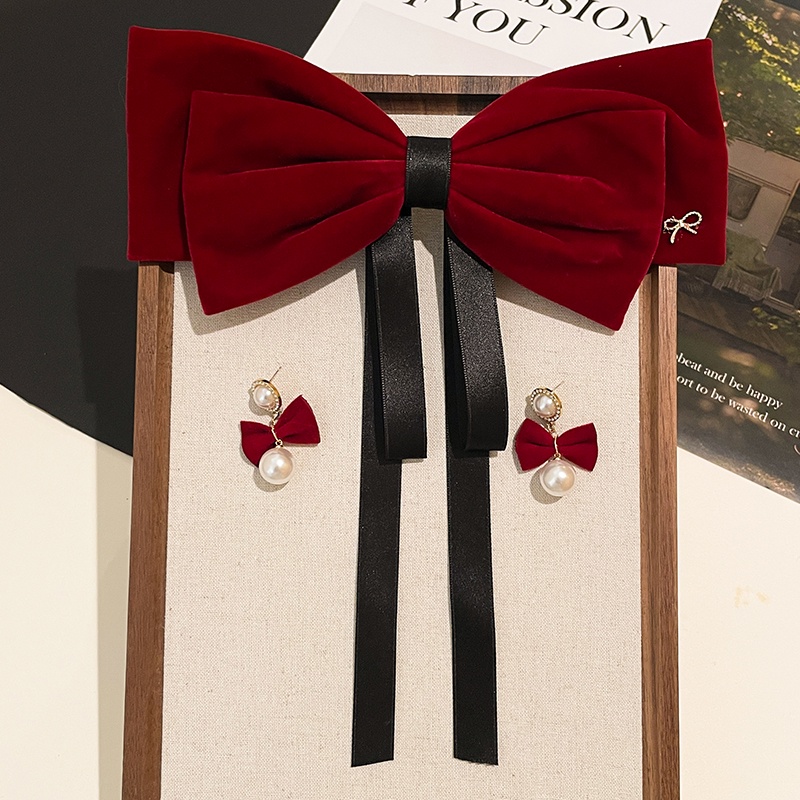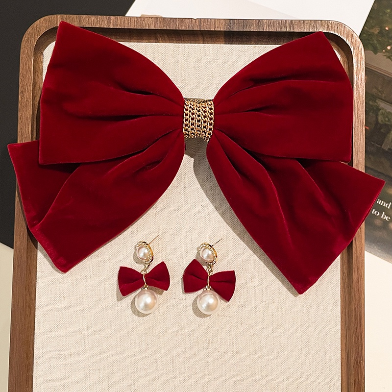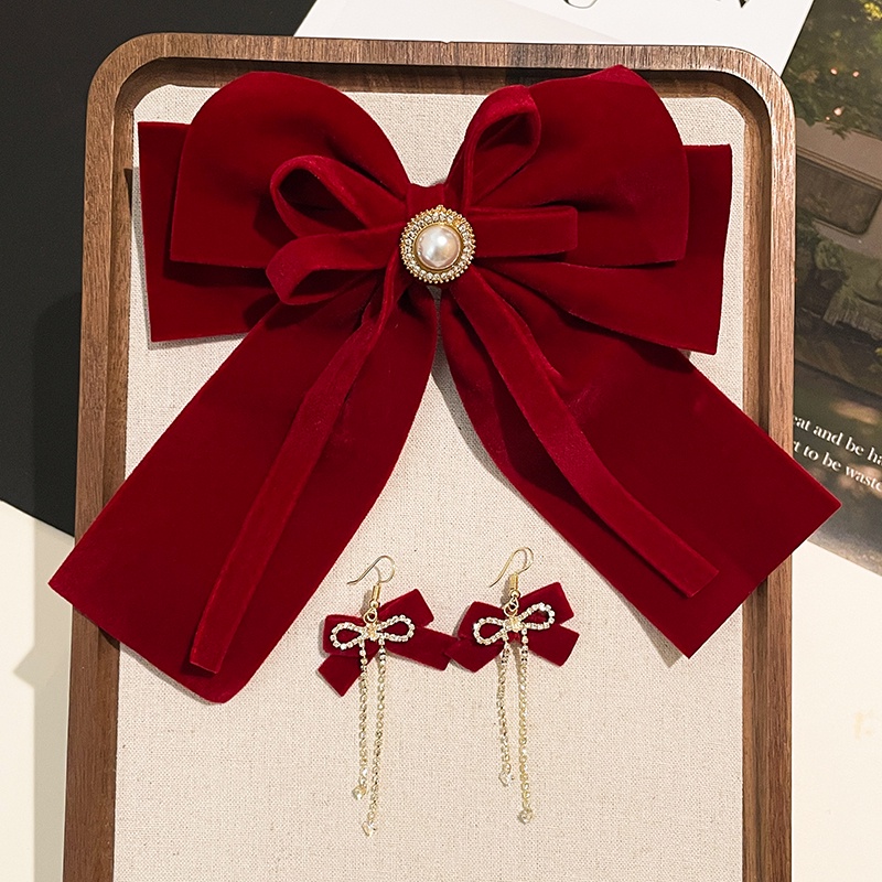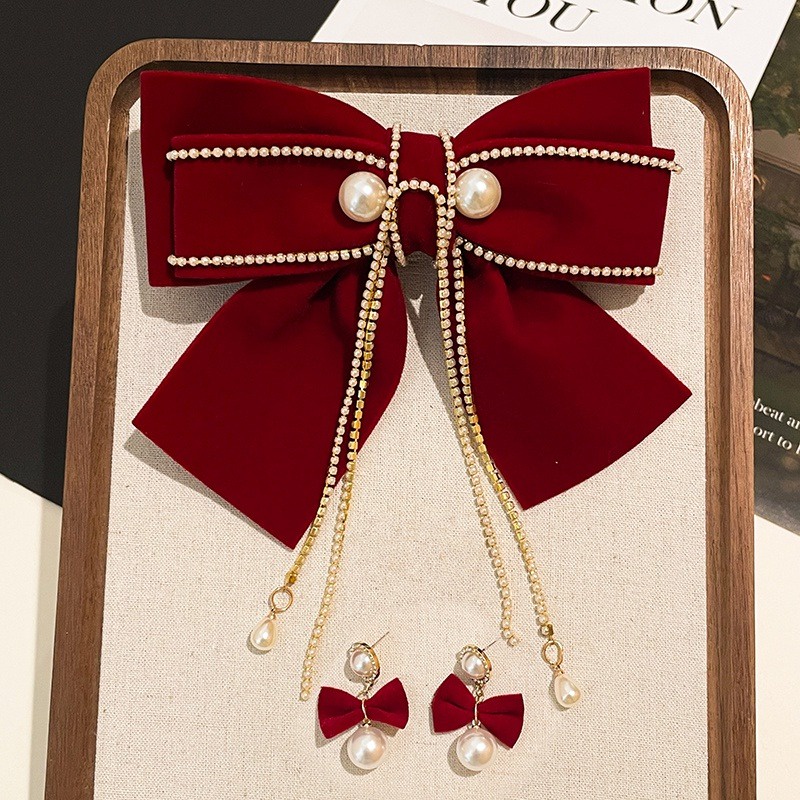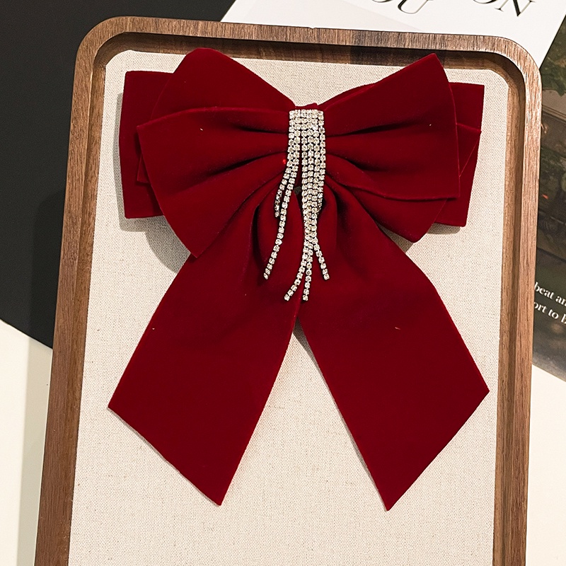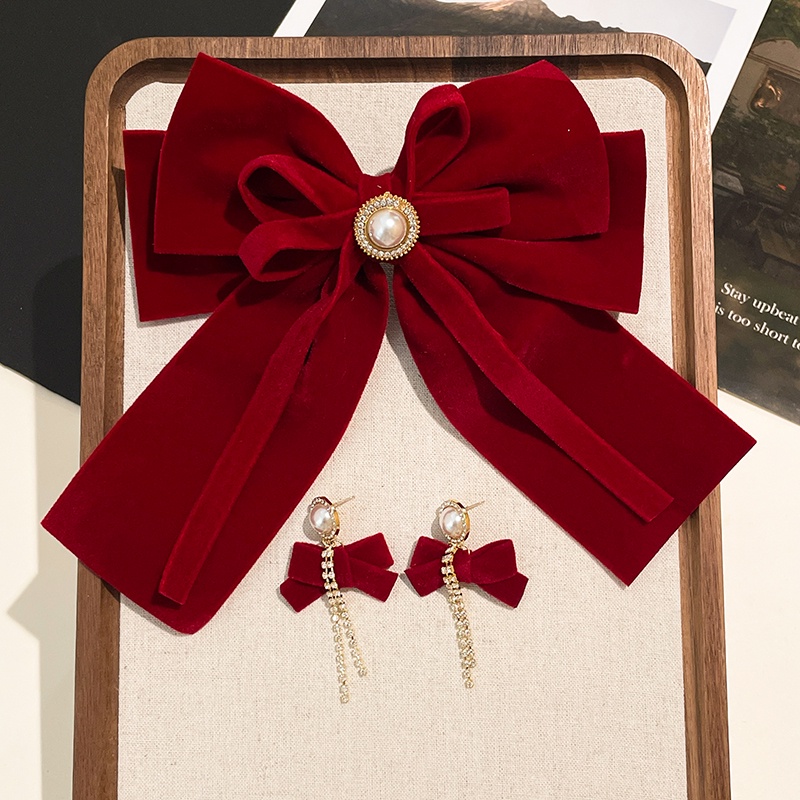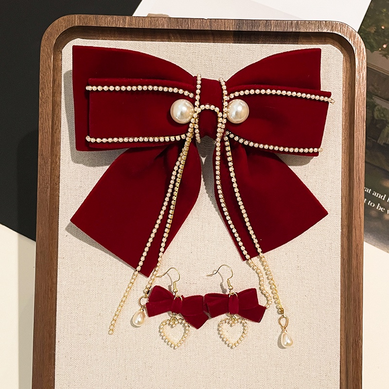 French Retro Red Velvet Large Bow Hair Clip Luxury High Quality Pearl Shiny Rhinestone Bridal Wedding Hairpin Temperament Headgear Gift