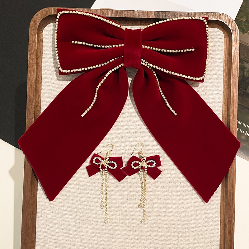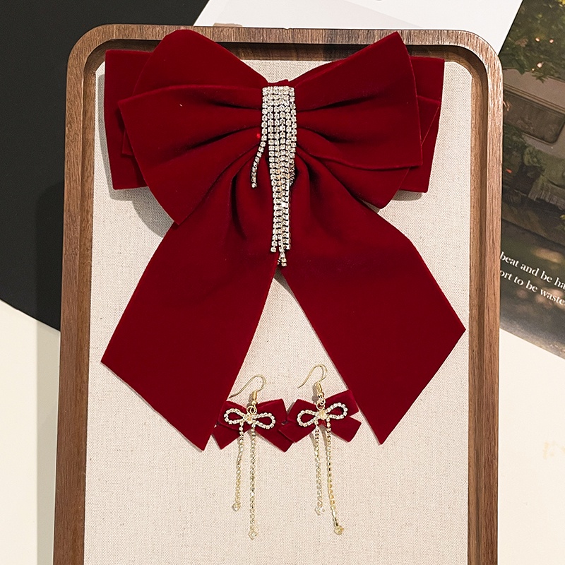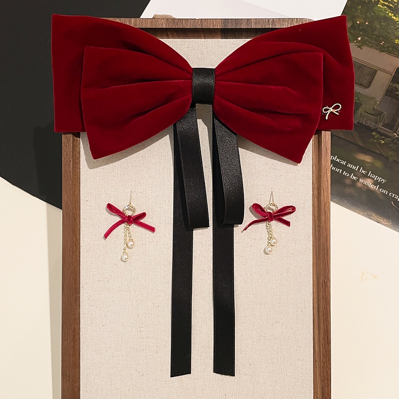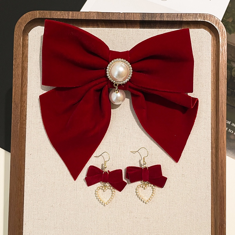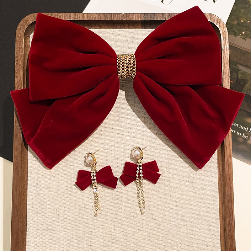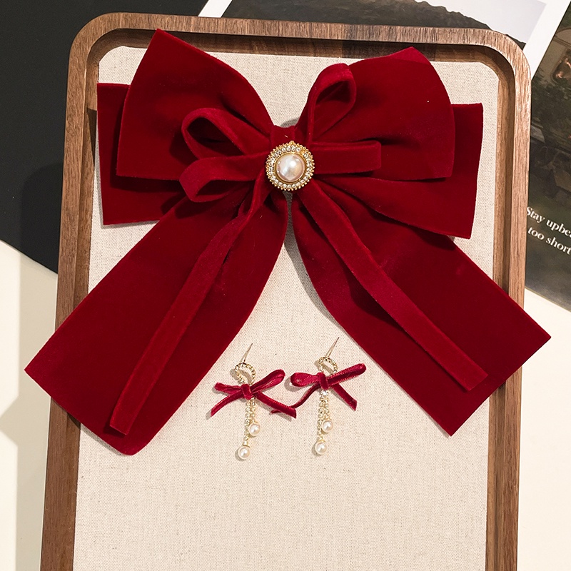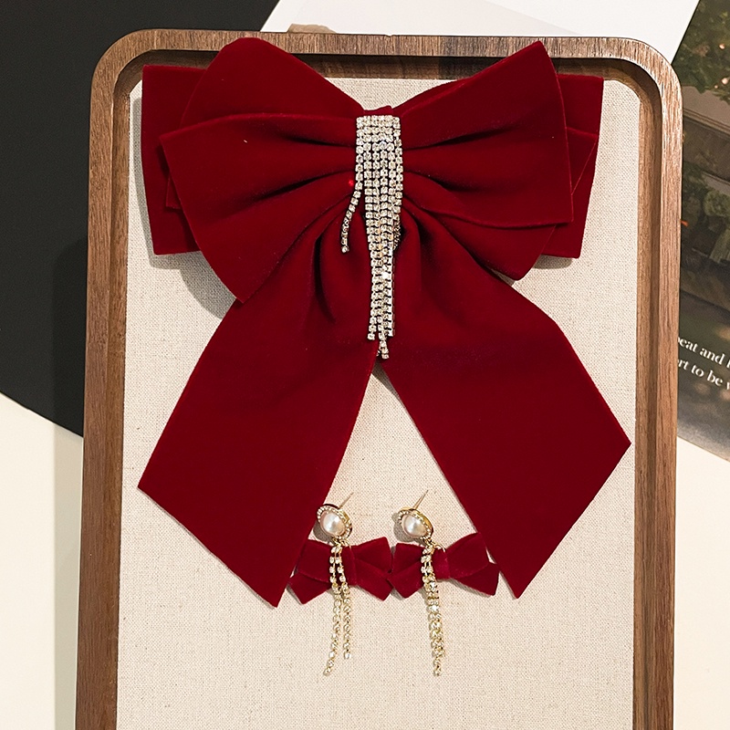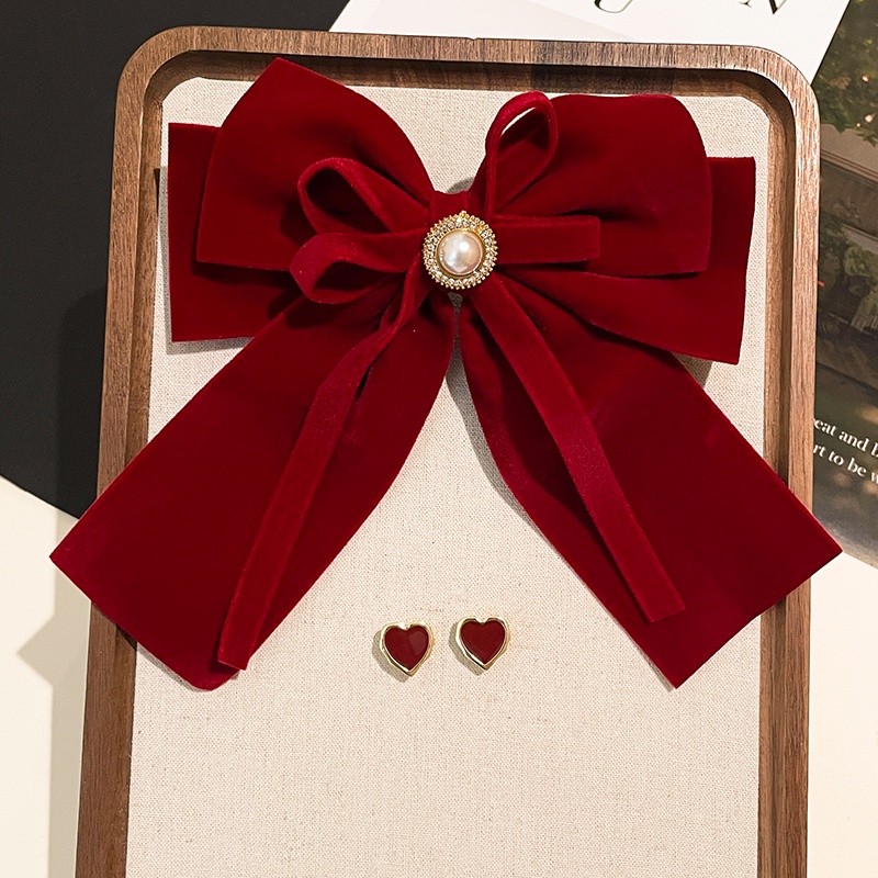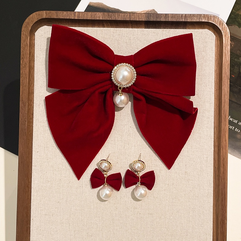 French Retro Red Velvet Large Bow Hair Clip Luxury High Quality Pearl Shiny Rhinestone Bridal Wedding Hairpin Temperament Headgear Gift