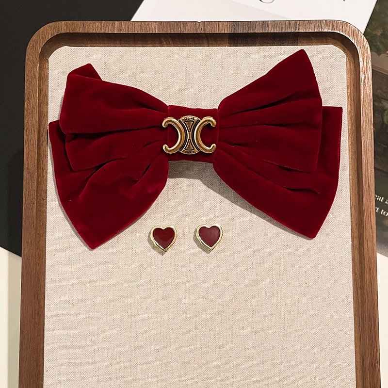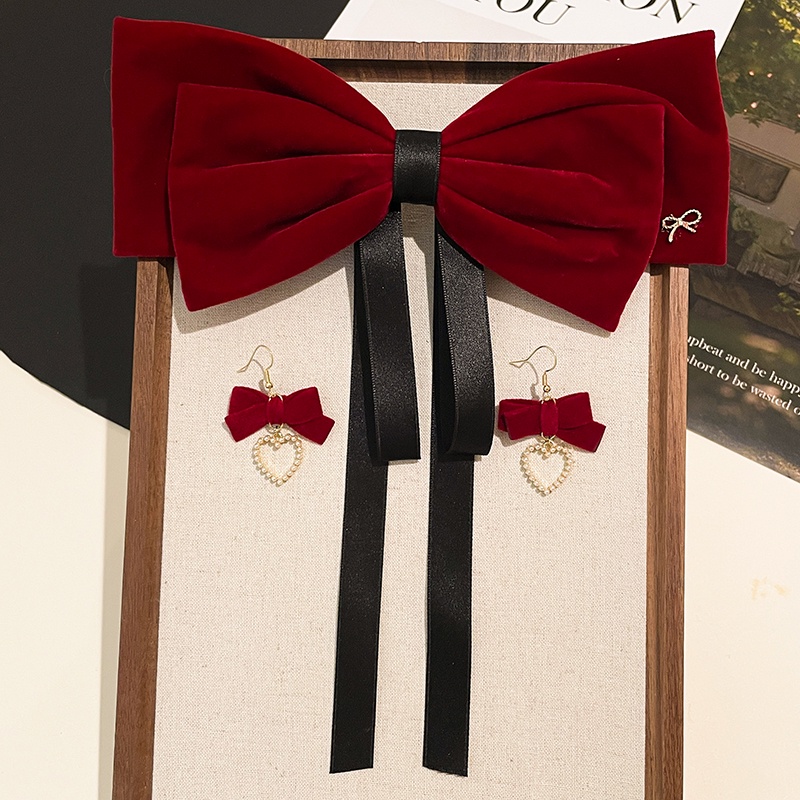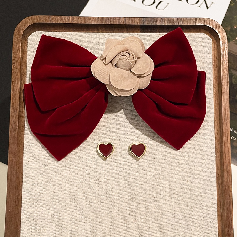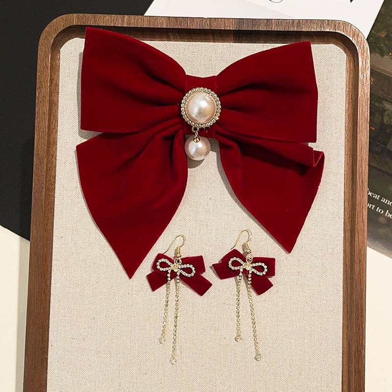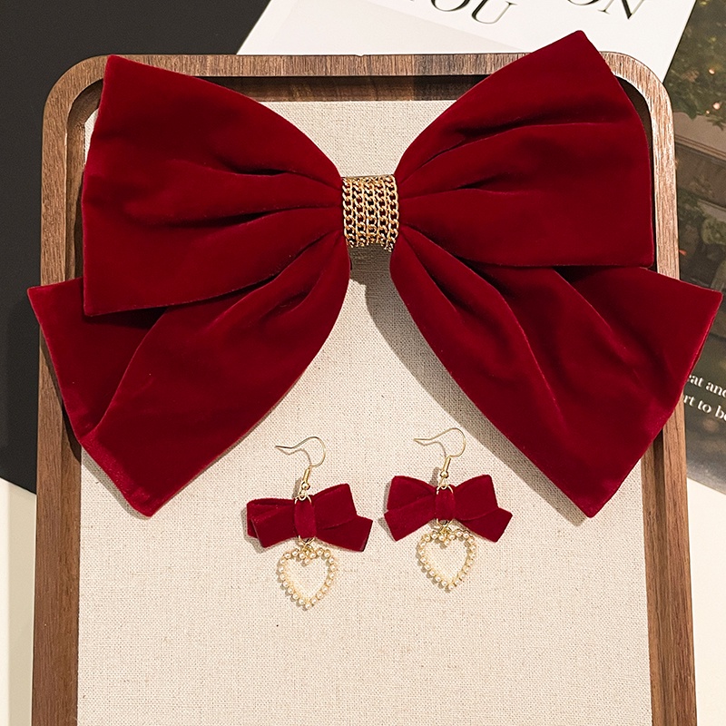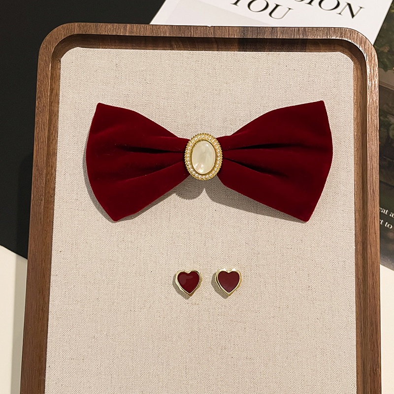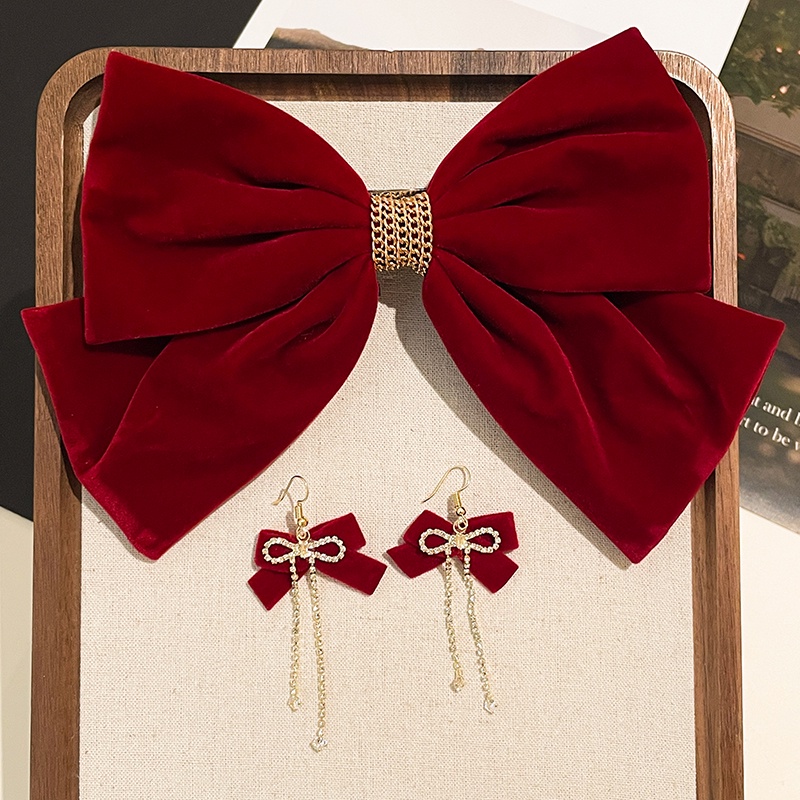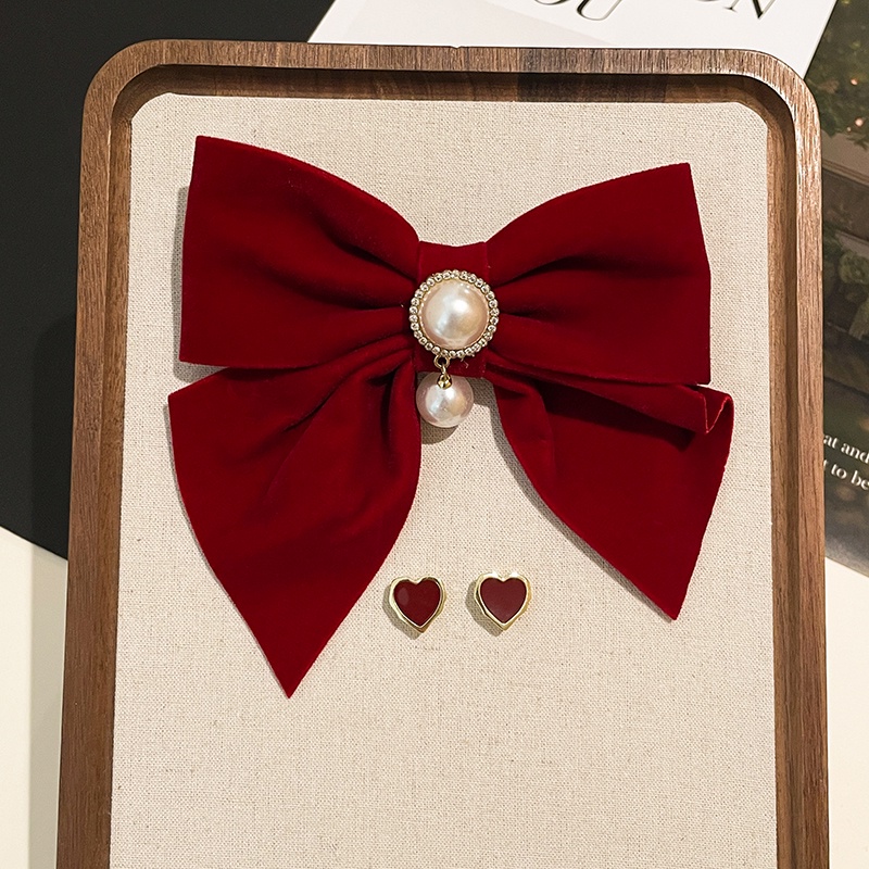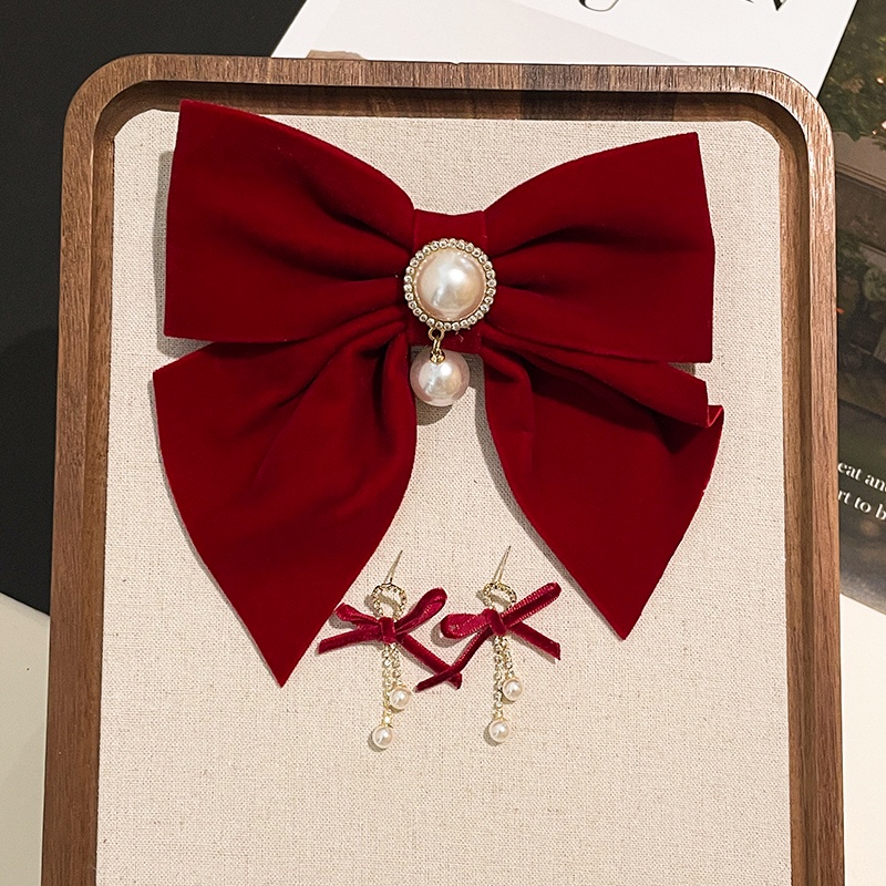 French Retro Red Velvet Large Bow Hair Clip Luxury High Quality Pearl Shiny Rhinestone Bridal Wedding Hairpin Temperament Headgear Gift