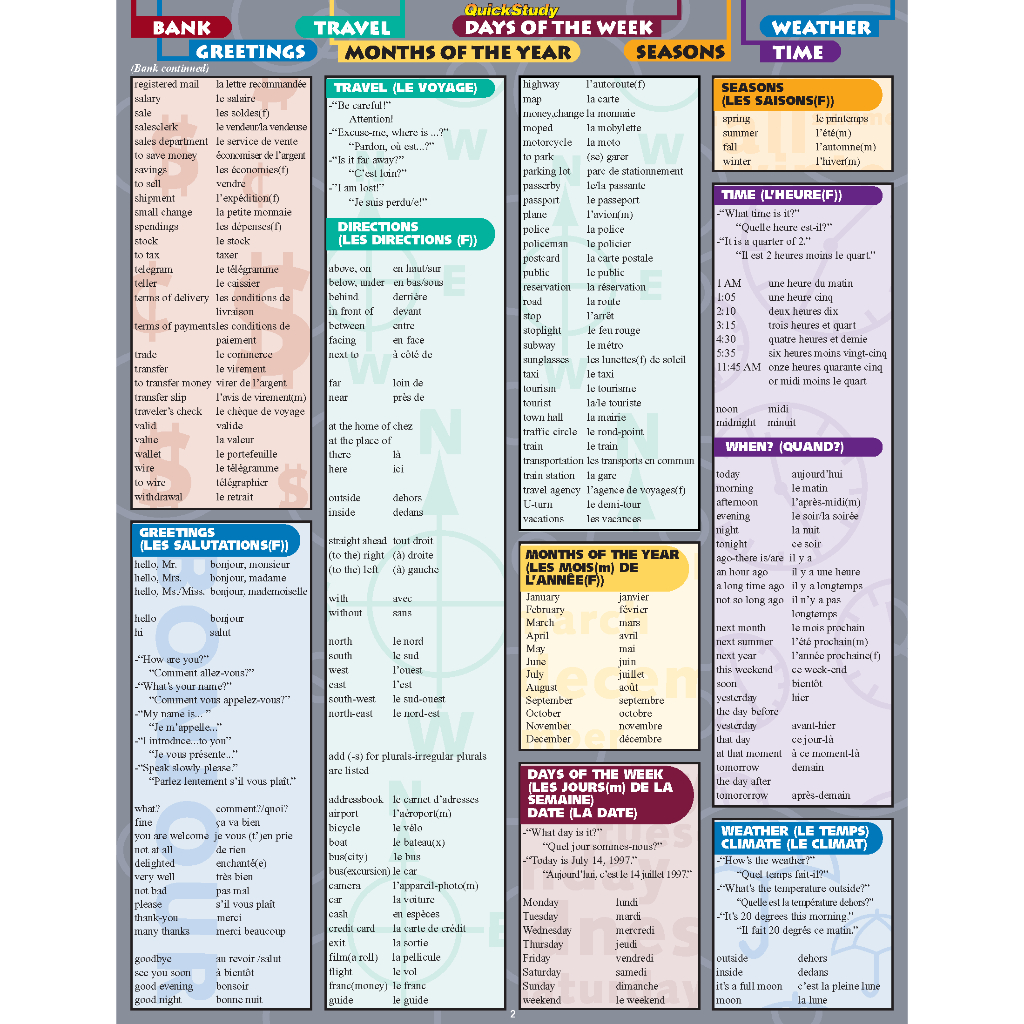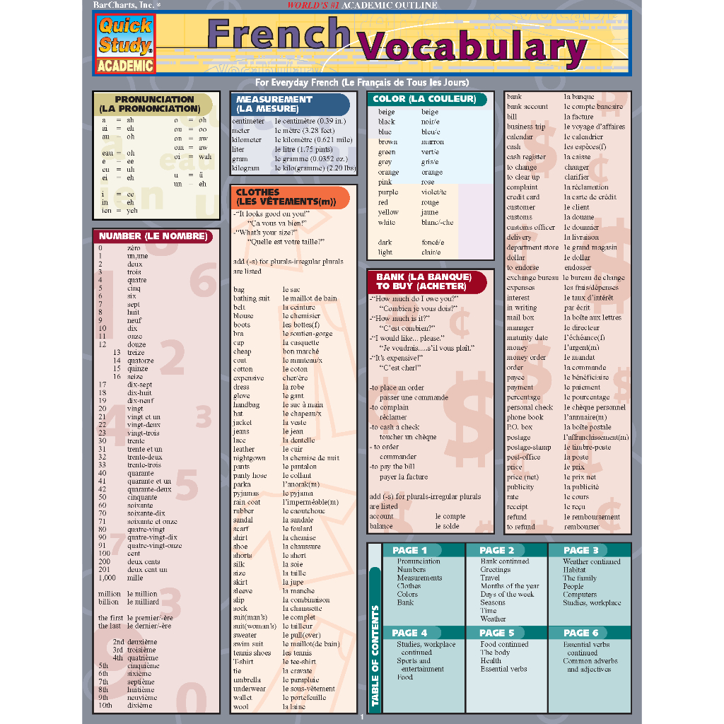 French Vocabulary (Cheat Sheet) - Laminated