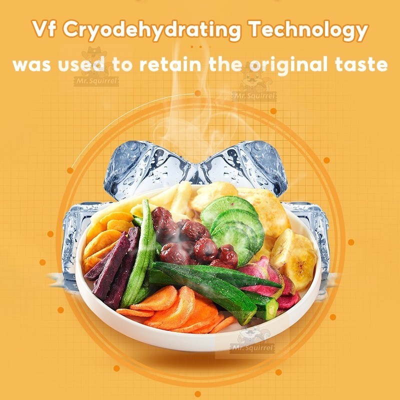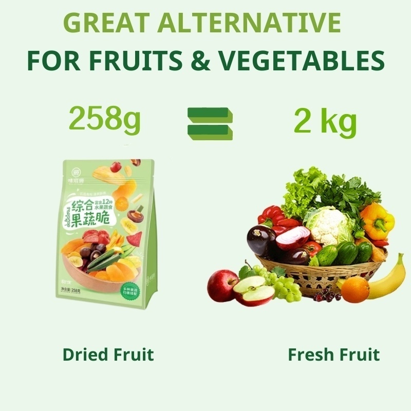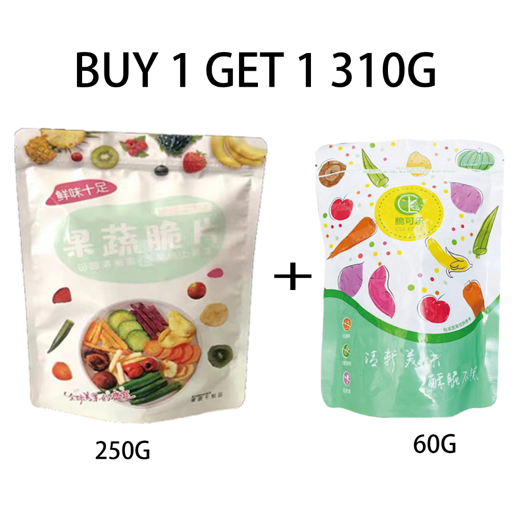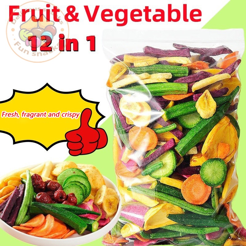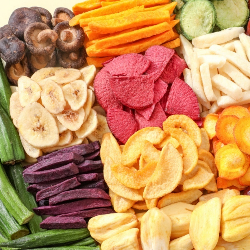 Fruit and vegetable crisps, dried fruit and vegetable snacks, mixed dried vegetables, assorted crisp snacks