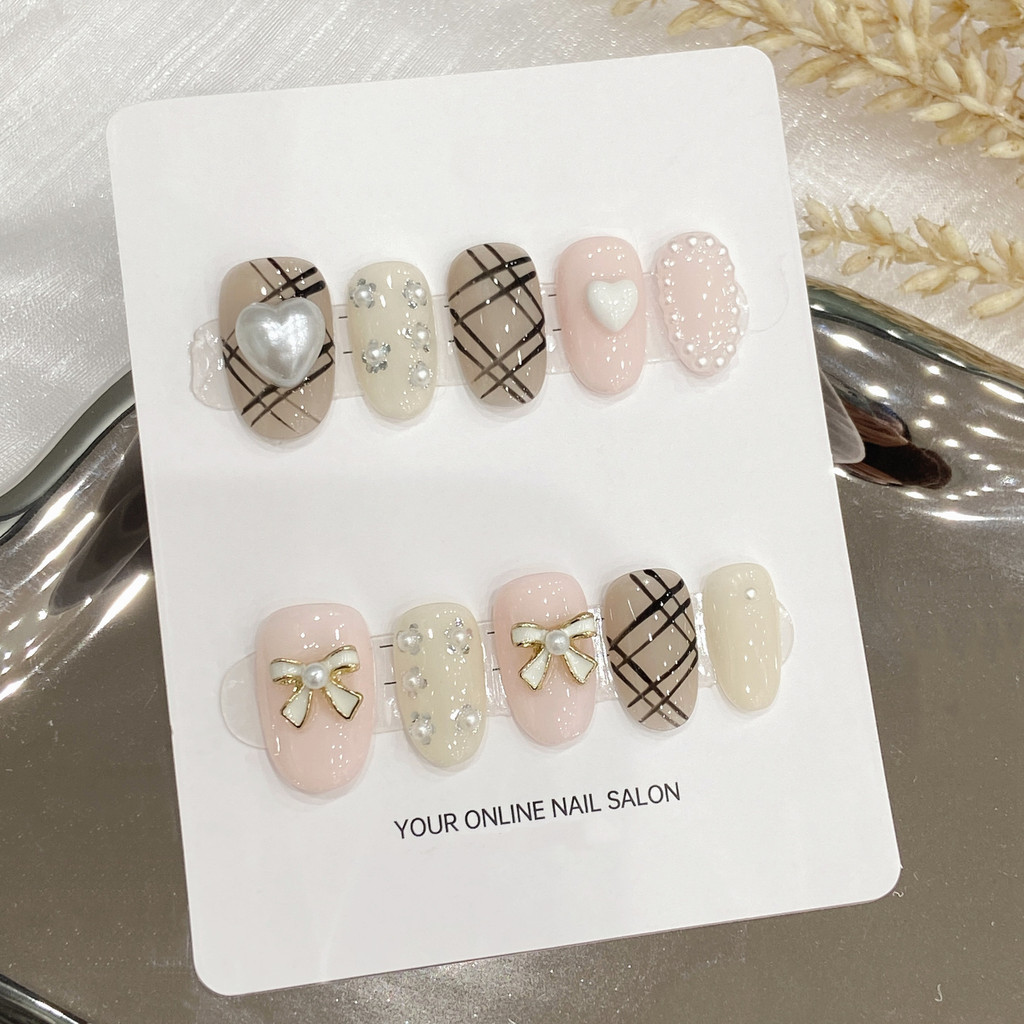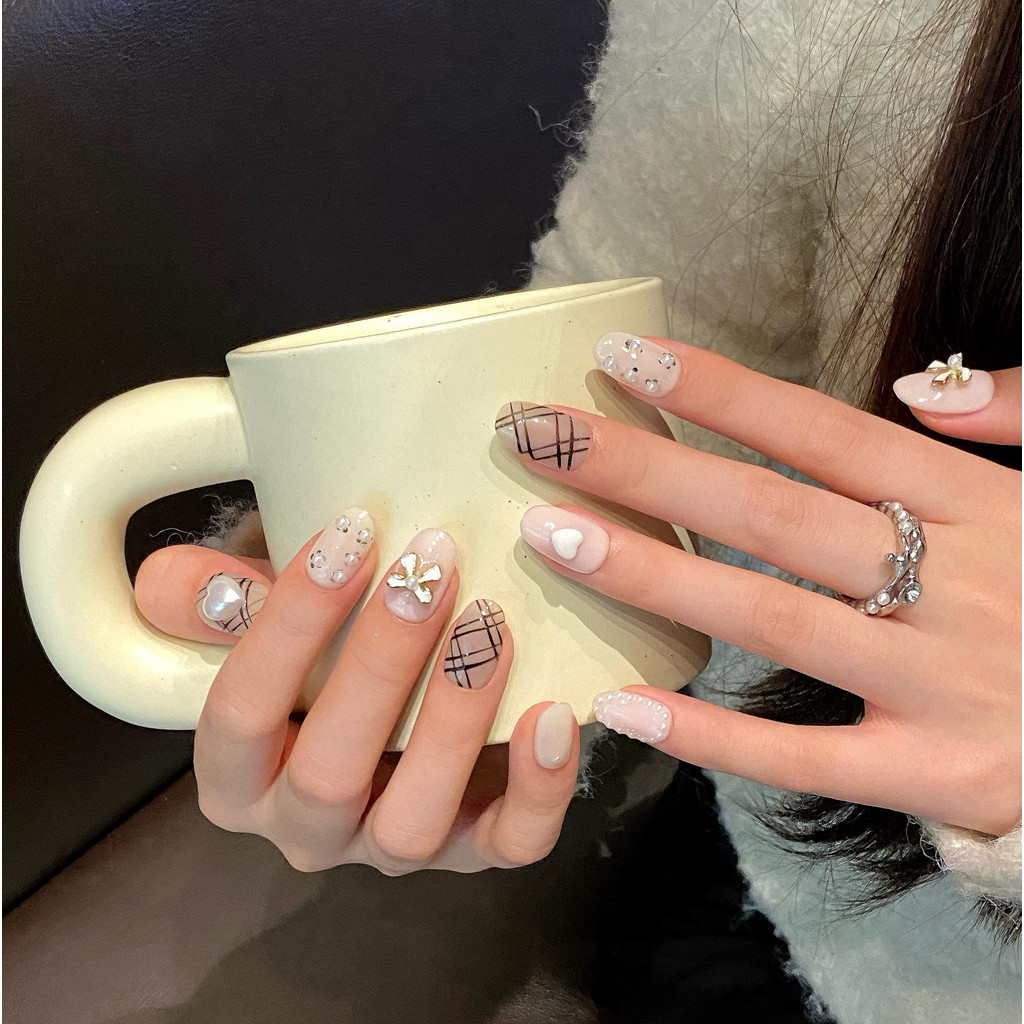 Full HANDMADE Short Oval Shape Artificial Fake Nails Art Bow Autumn Winter Love Heart Phototherapy Fake Nail Press on Nail Reusable And Removable With Free Glue