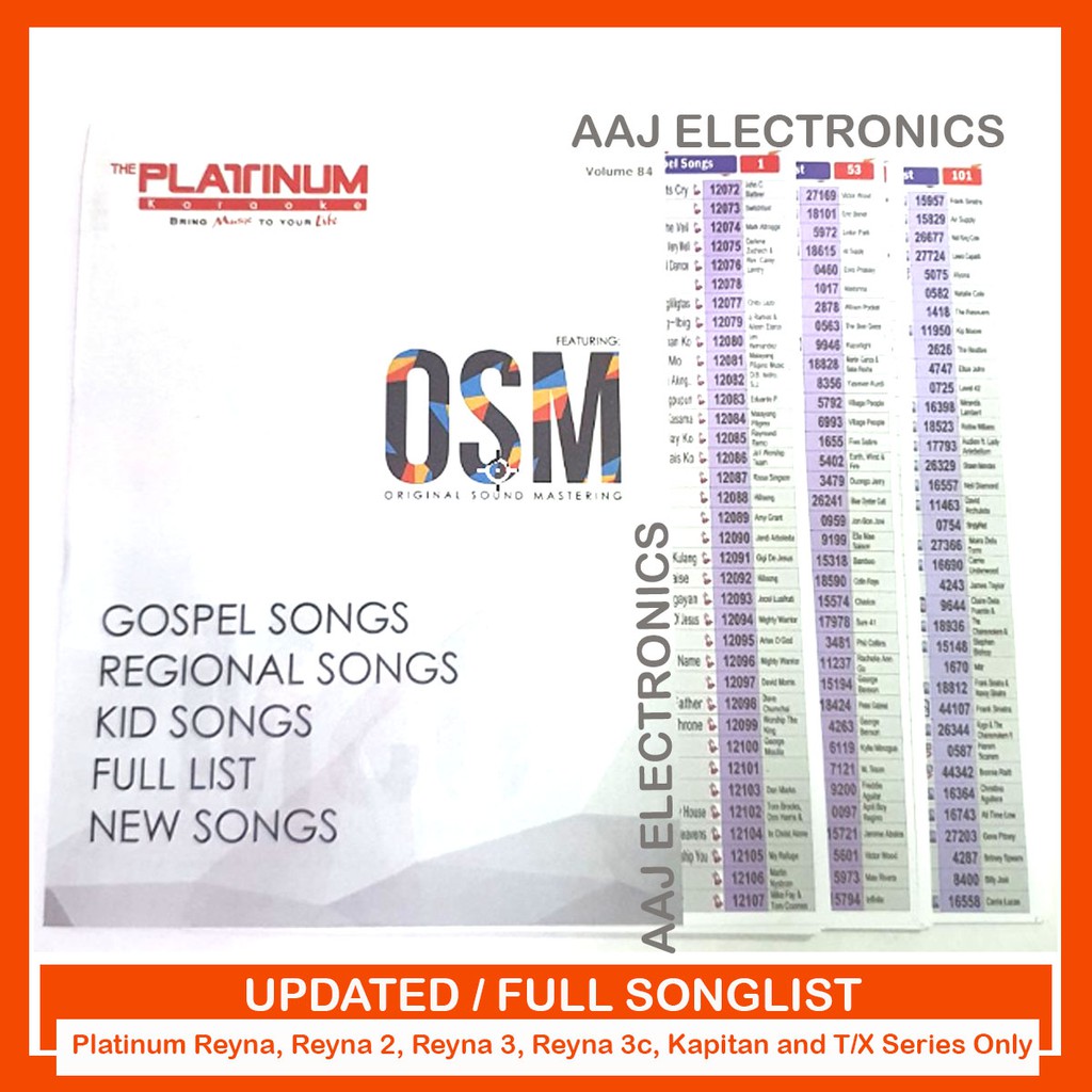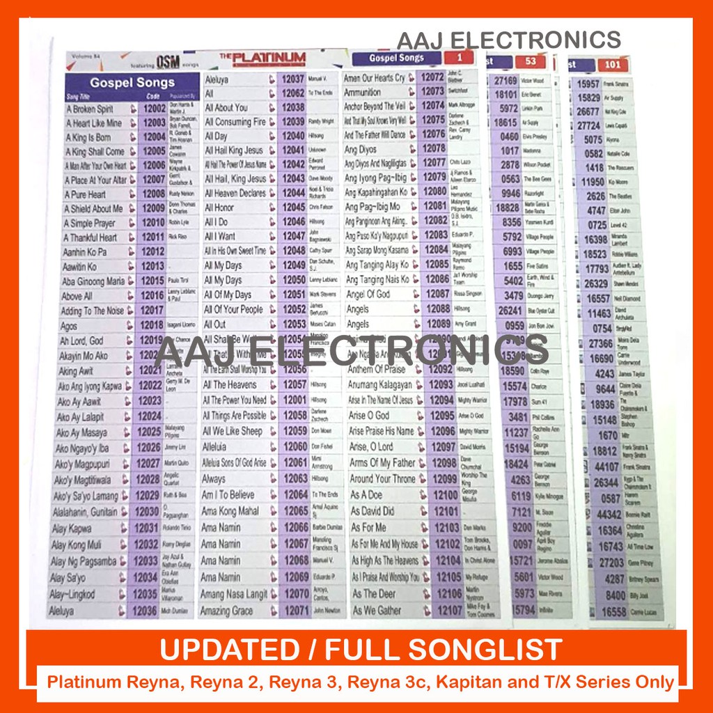 Full Songlist for Platinum Karaoke Reyna Reyna 2 Reyna 3 Reyna 3c Kapitan Piano - Latest