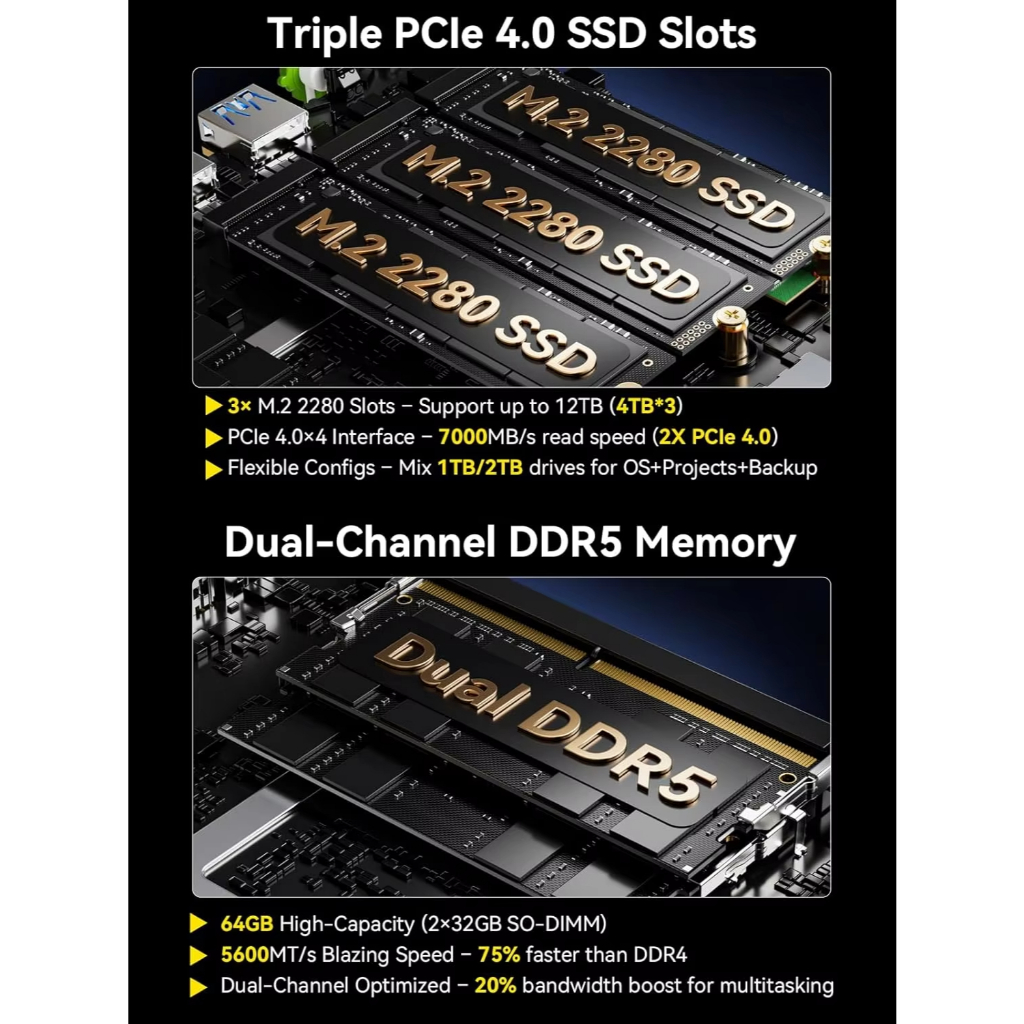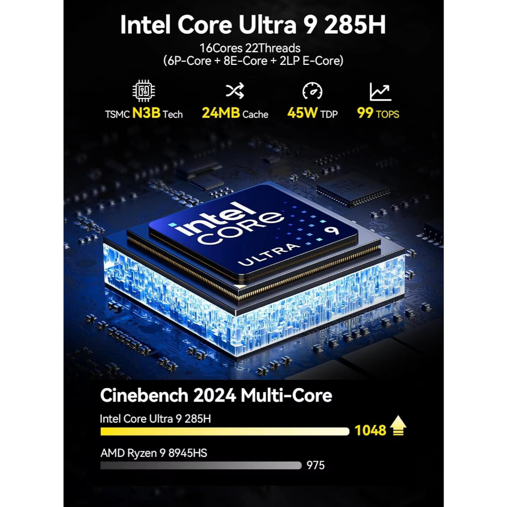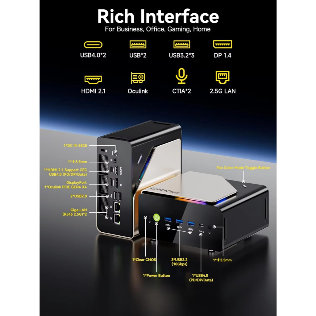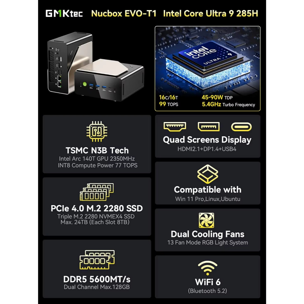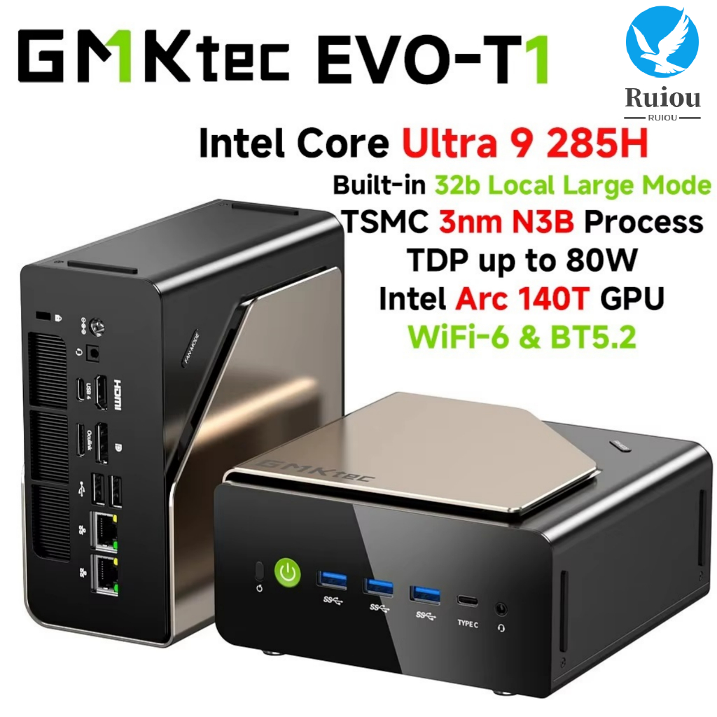 GMKtec EVO-T1 AI Mini PC Intel Core Ultra 9 285H 2*DDR5 64GB 1TB/2TB 3*PCIe4.0 SSD Desktop Supercomputing Center Built-in 32b LLM OCulink MINI PC Host
