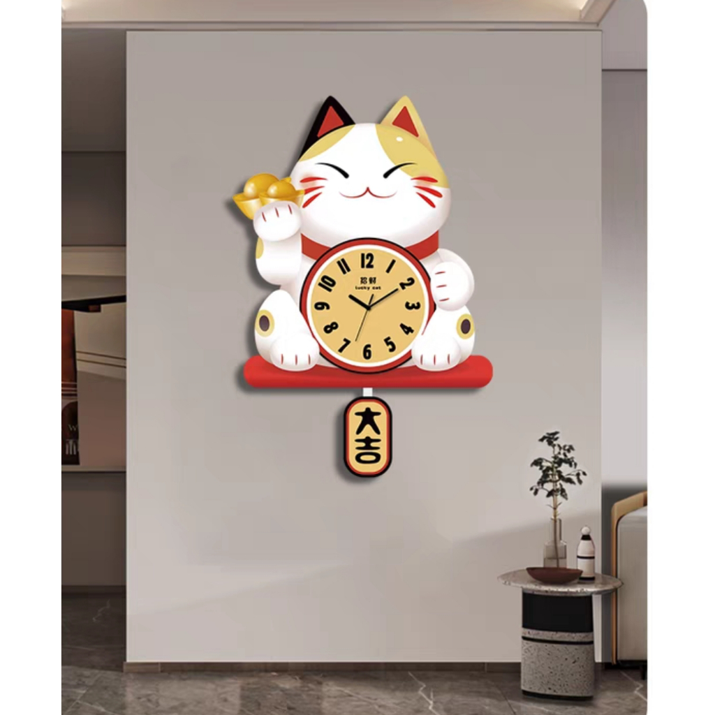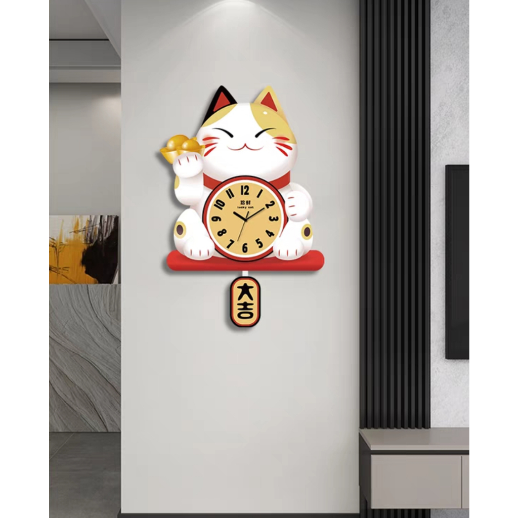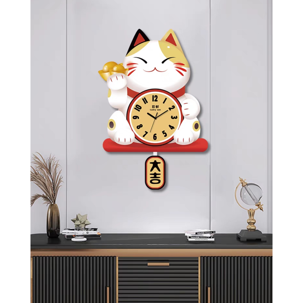 GOOD LUCK CAT WALL CLOCK LUCKY PENDULUM TAIL SWING DECORATIVE CLOCKS FORTUNE CHARMS