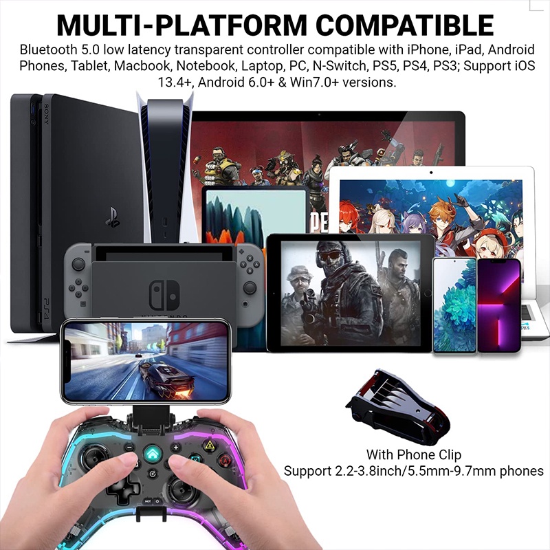 Game Controller for iOS Android, Wireless Gamepad Joystick for iPhone 13/12/11, iPad, MacBook, Samsung, Tablet, PC, N-Switch, PS5, PS4, PS3, with Programming, Turbo, RGB Light