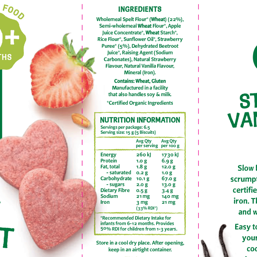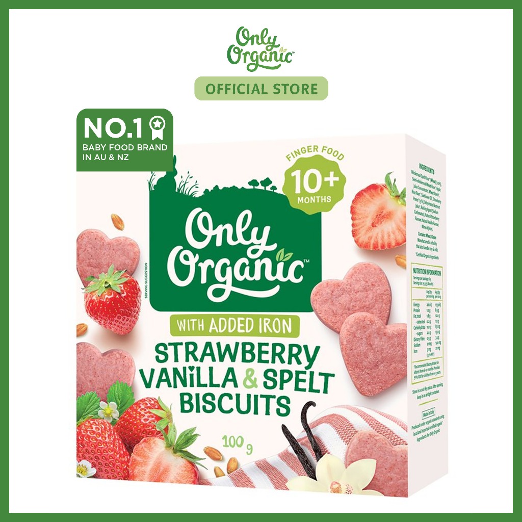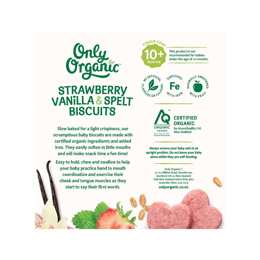 Only Organic Strawberry Vanilla & Spelt Biscuits 100g [10mos+] (Iron Enriched, Nutritionist Approved