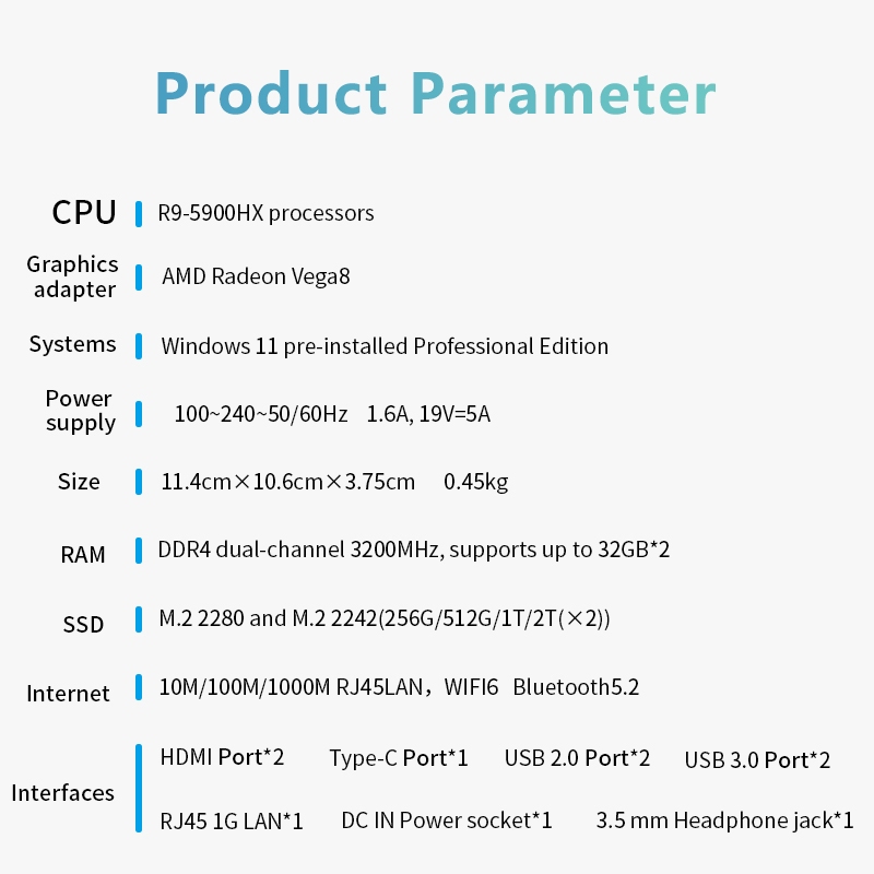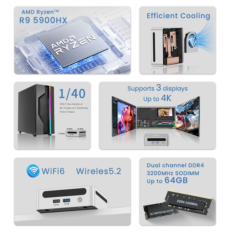 GenMachine Mini PC Ren series AMD Ryzen 9 5900HX SSD 2*DDR4 3200Mhz Windows 11 Pro 3.3.GHz Up to 4.6GHz WIFI6 BT5.2 Support 64GB RAM Gaming Computer Business Office Design Mini PC