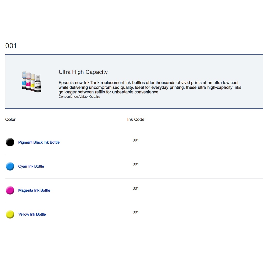 Genuine EPSON 001 Ink L4150 L4160 L6160 L6170 L6190 Eco Tank Printer Black Cyan Yellow Magenta Color