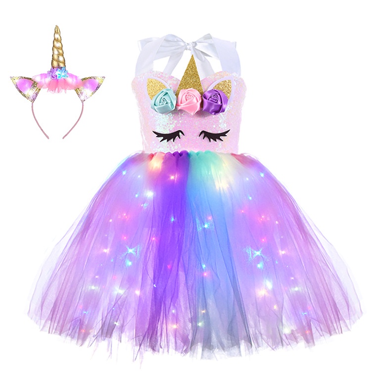 Girls Suit Unicorn With Light Glowing tutu Skirt Dress Halloween Costume Princess Gauze