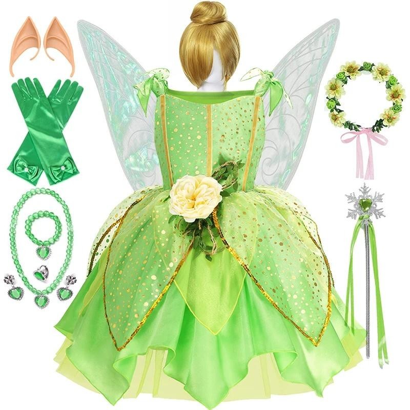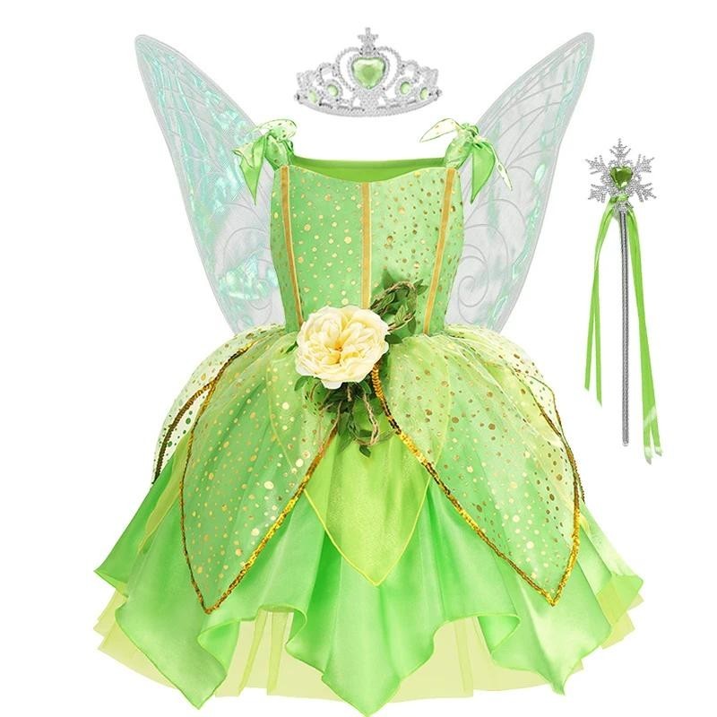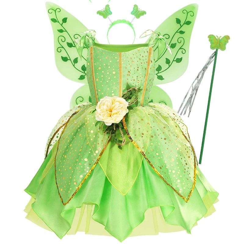 Girls Tinker Bell Costume Spring Costume for Kids Green Tinkerbell Fancy Dress Fairy Princess Cosplay Carnival Party Clothing