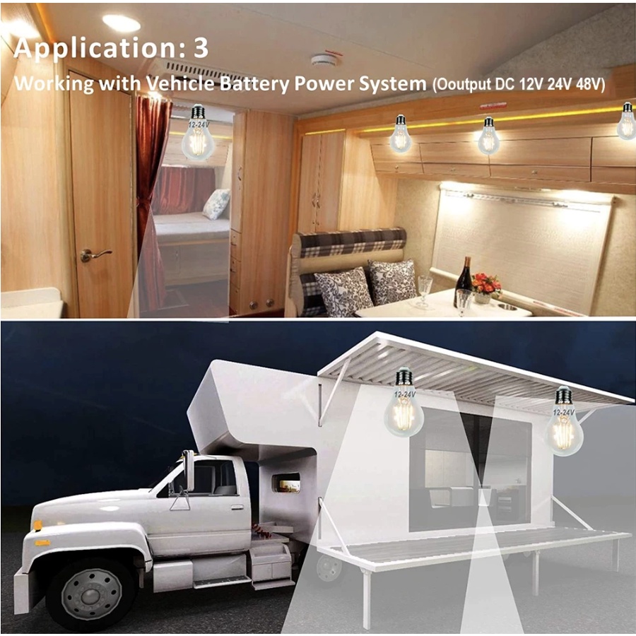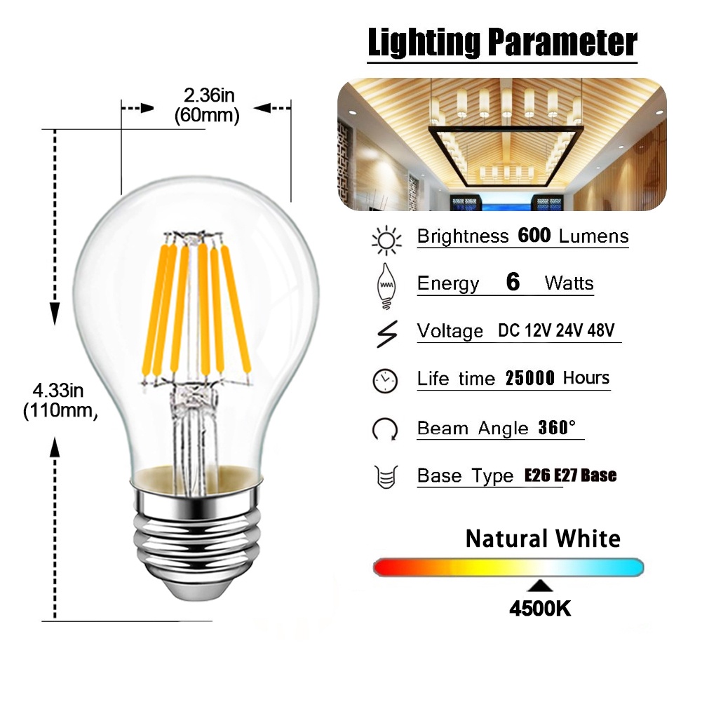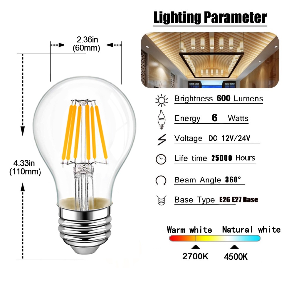 Grensk DC 12V 24V Led Lamp A19 A60 Filament Bulb Low Voltage 6 Watt Globe Led Bulb Daylight White 4500K Warm White 2700K E27 E26