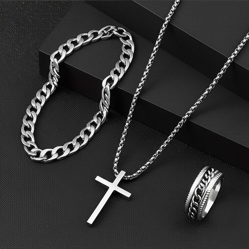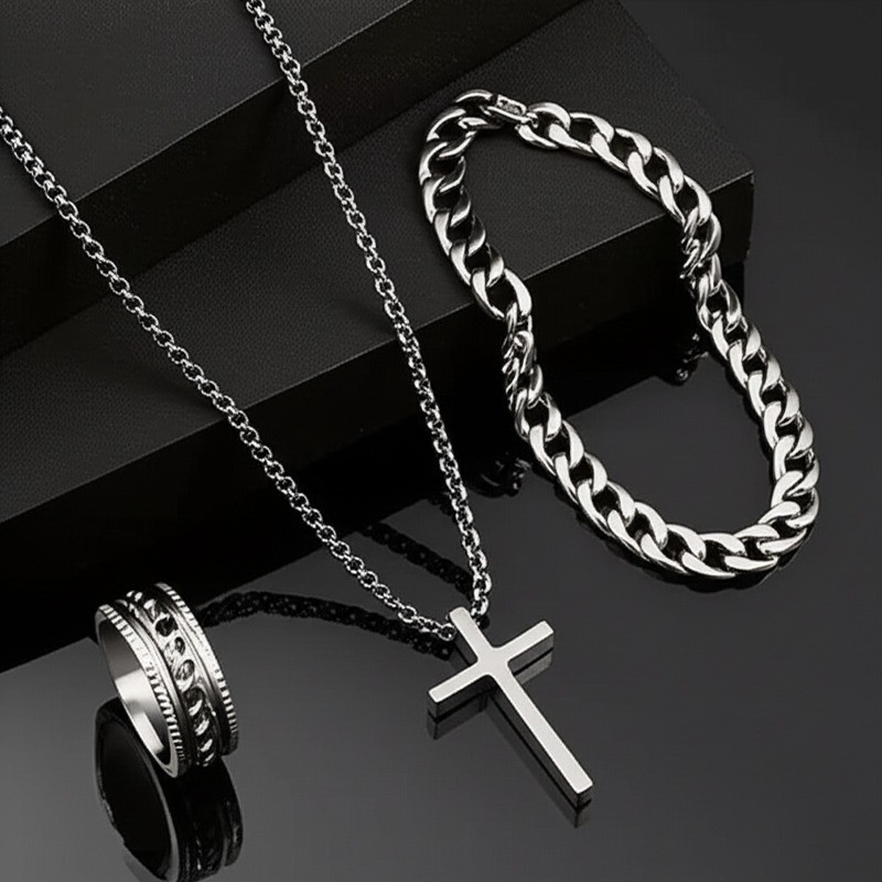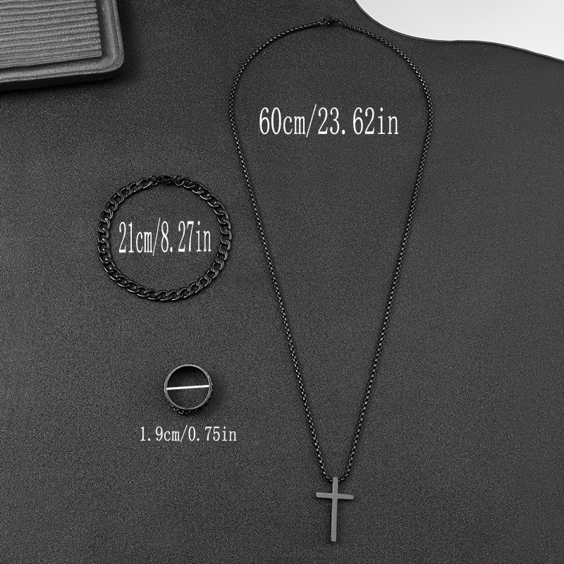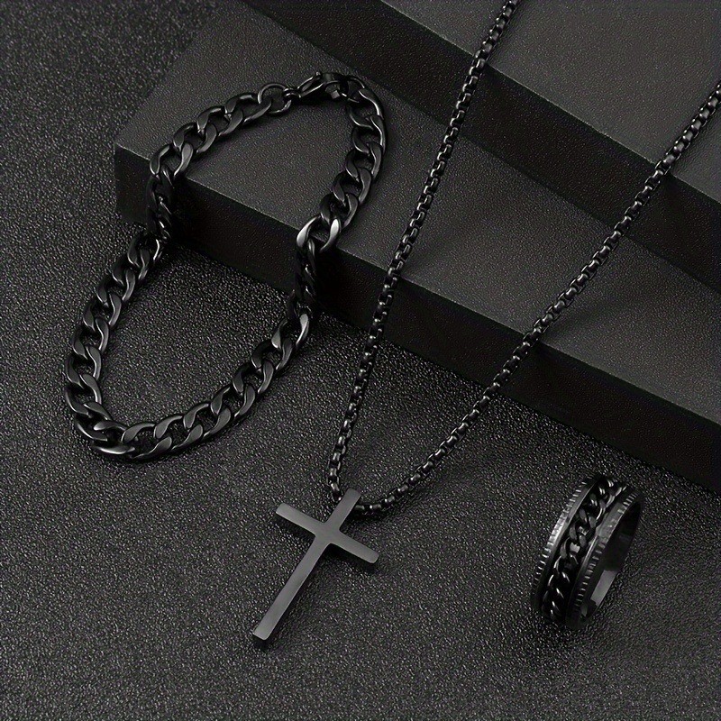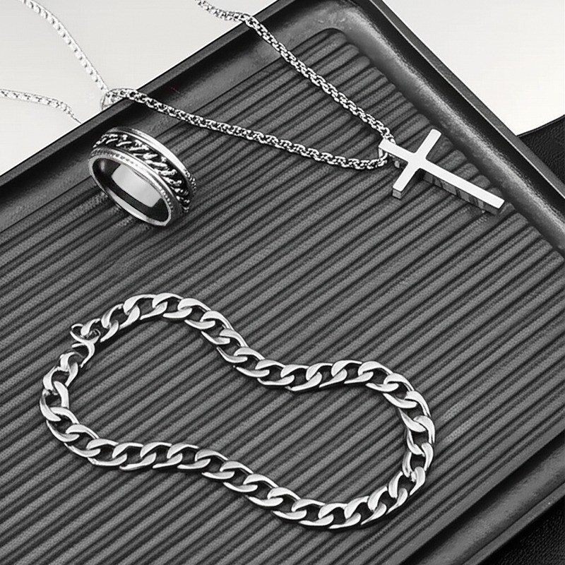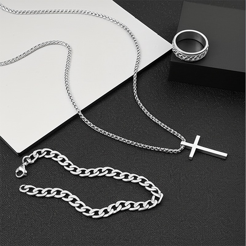 3Pcs Titanium Steel Cross Pendant Necklace Bracelet Ring For Men Korean Stainless Jewelry Set Sliver