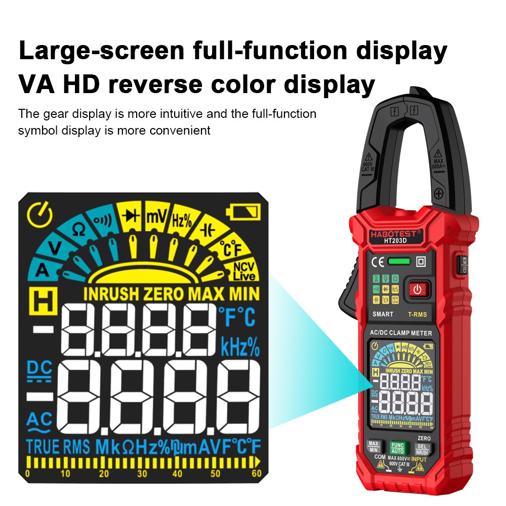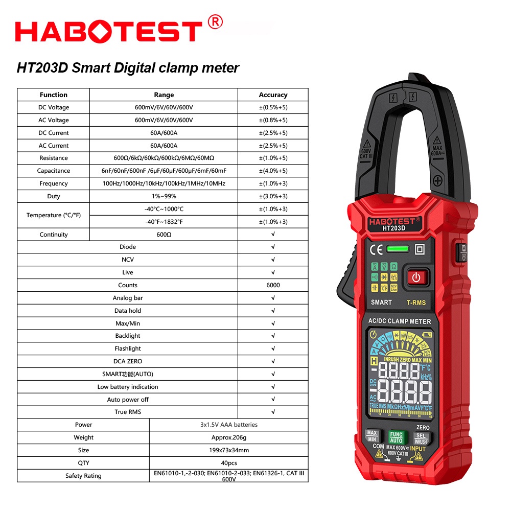 HABOTEST Digital Clamp Meter HT203D High Accuracy Clamp Multimeter Voltage Tester Current Temp Capacitance Resistance Diodes Continuity