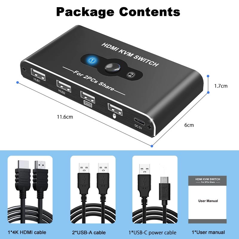 HDMI 2.0 KVM Switcher USB2.0/3.0 HDIM 2 input 1 Output 4K 60Hz 2PC Sharing 1 Monitor Mouse Keyboard