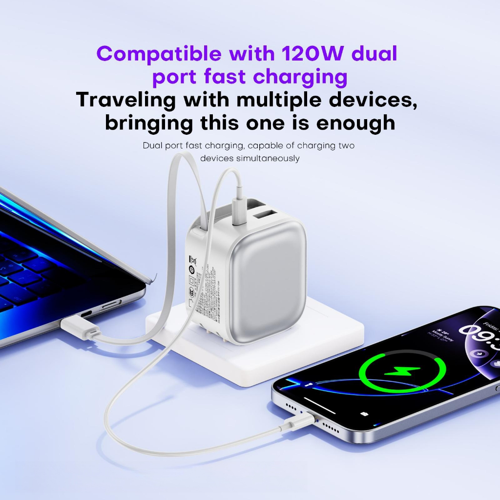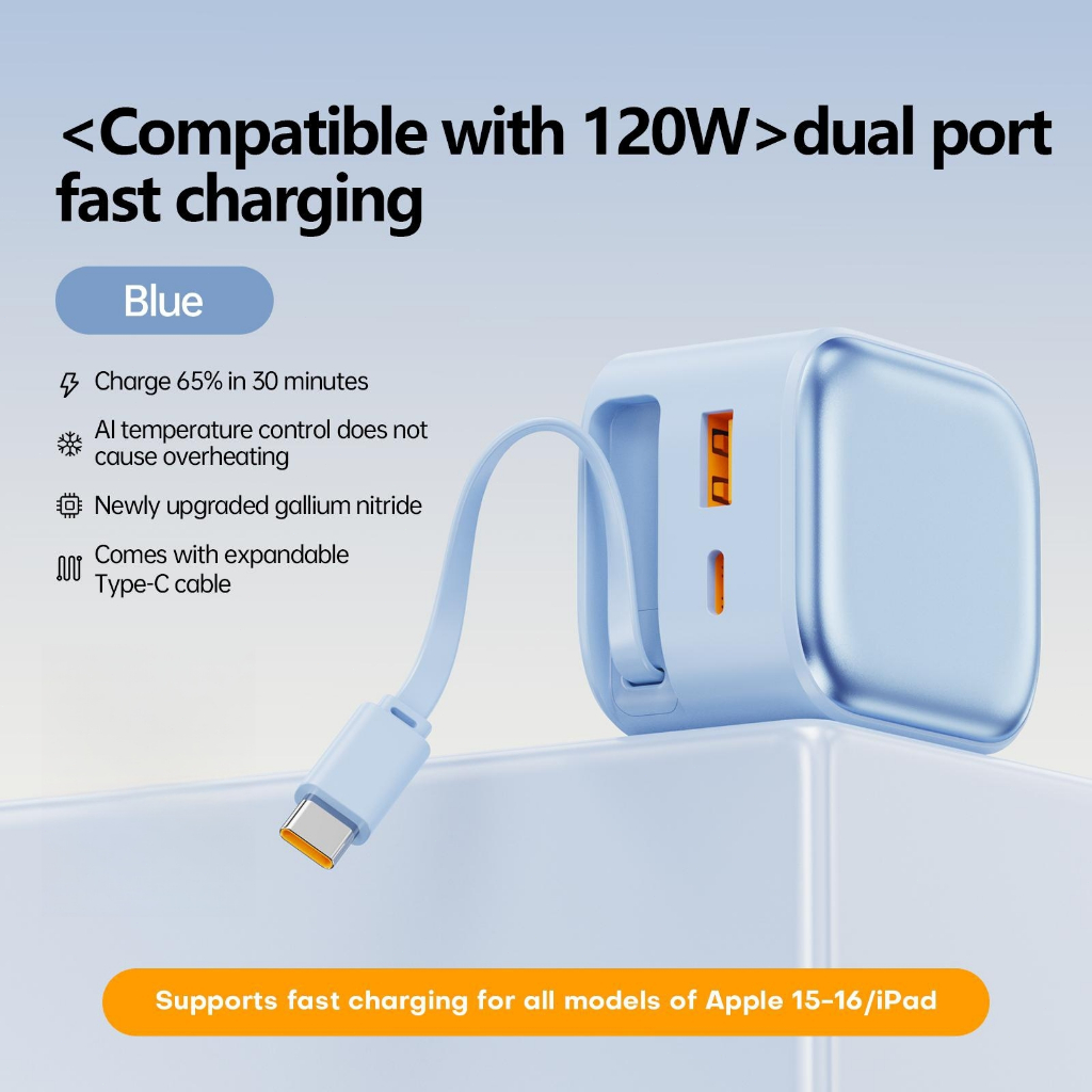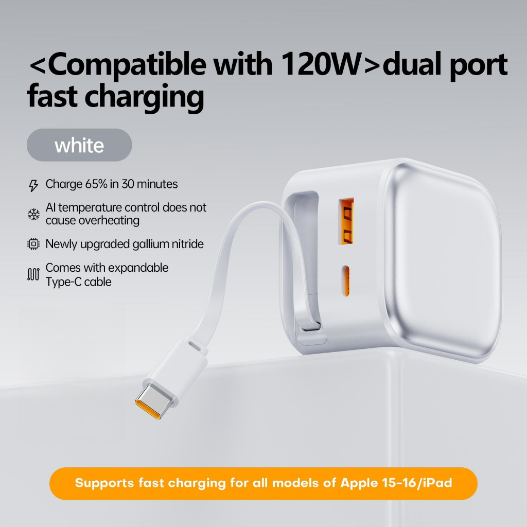 HINAR 3 in 1 GaN Charger Retractable 120W Fast Charger with Type-C Cable For iPhone iPad Samsung