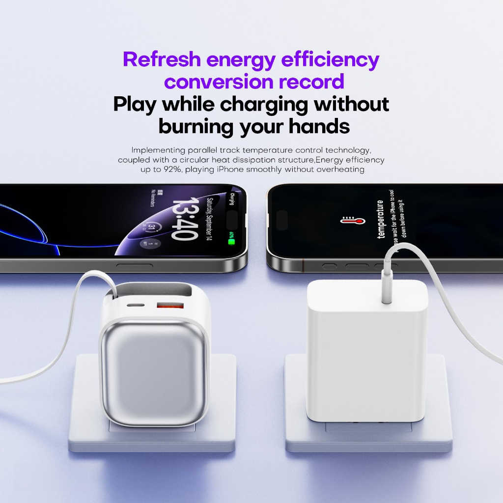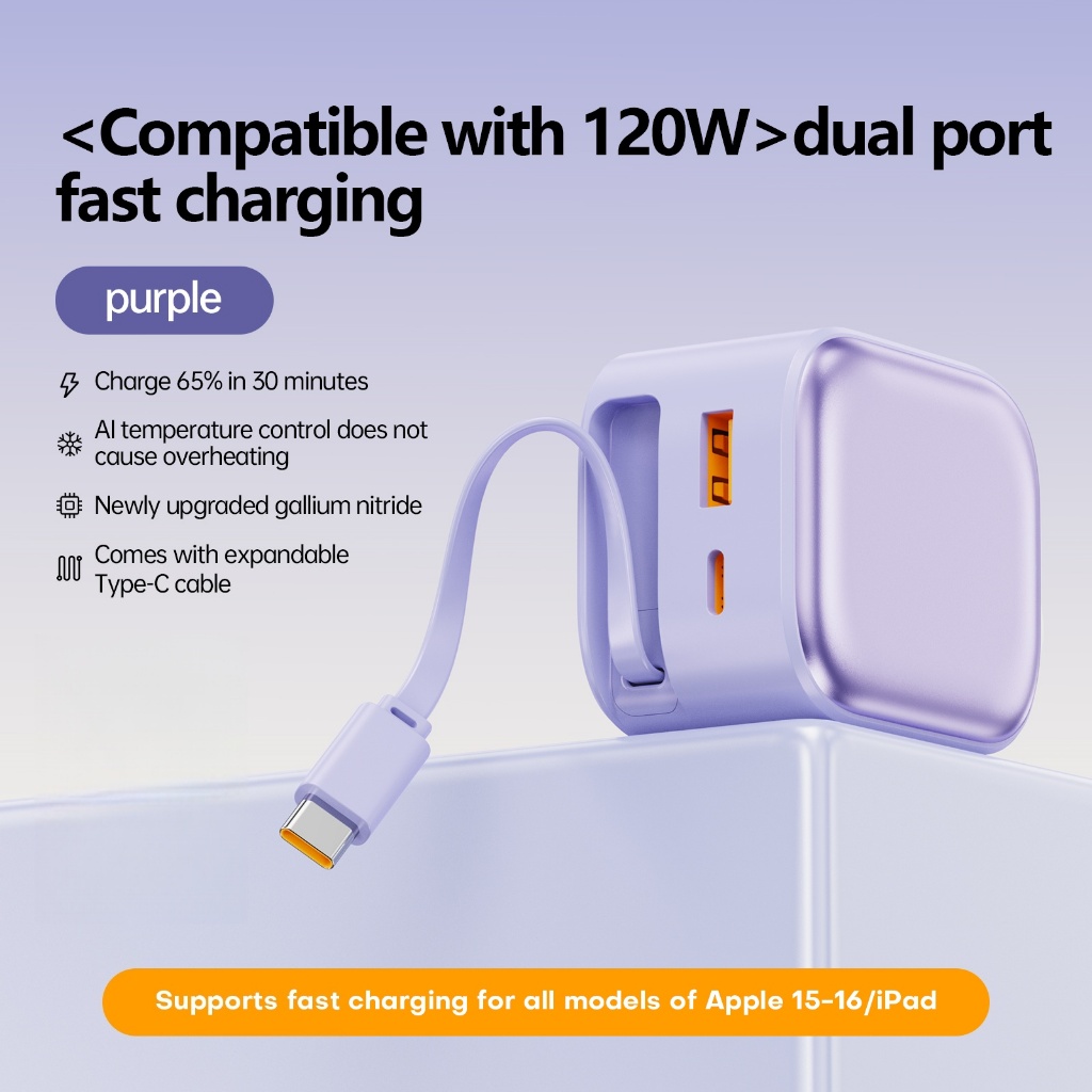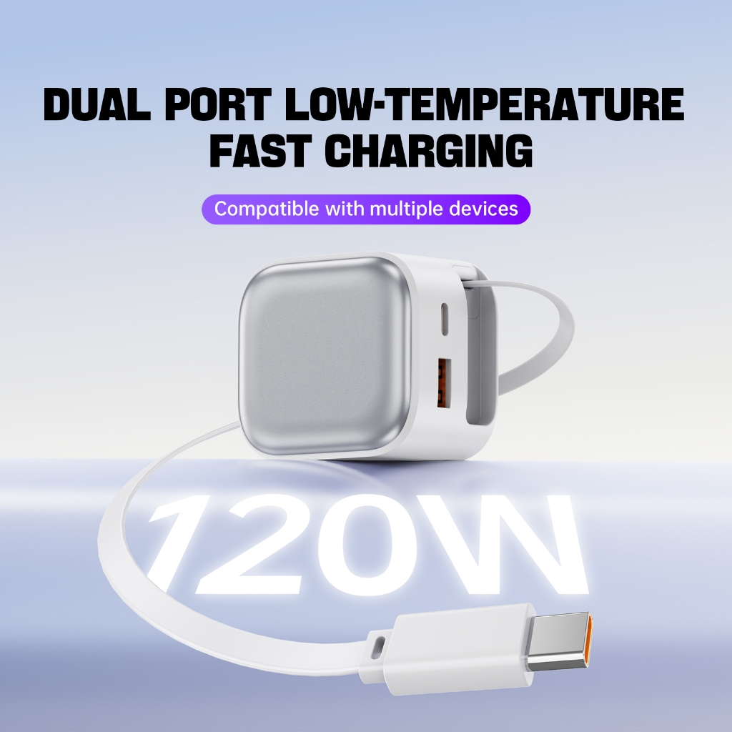 HINAR 3 in 1 GaN Charger Retractable 120W Fast Charger with Type-C Cable For iPhone iPad Samsung