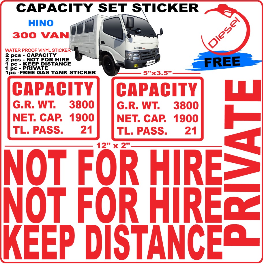 HINO 300 VAN CAPACITY STICKER SET NOT FOR HIRE / PRIVATE /KEEP DISTANCE /DIESEL STICKER