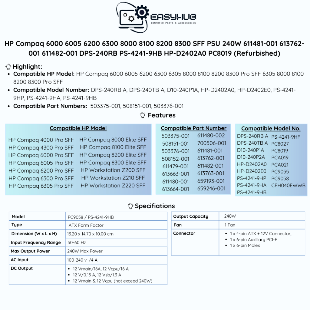 HP Compaq 6000 6005 6200 6300 8000 8100 8200 8300 SFF PSU 240W (Refurbished)