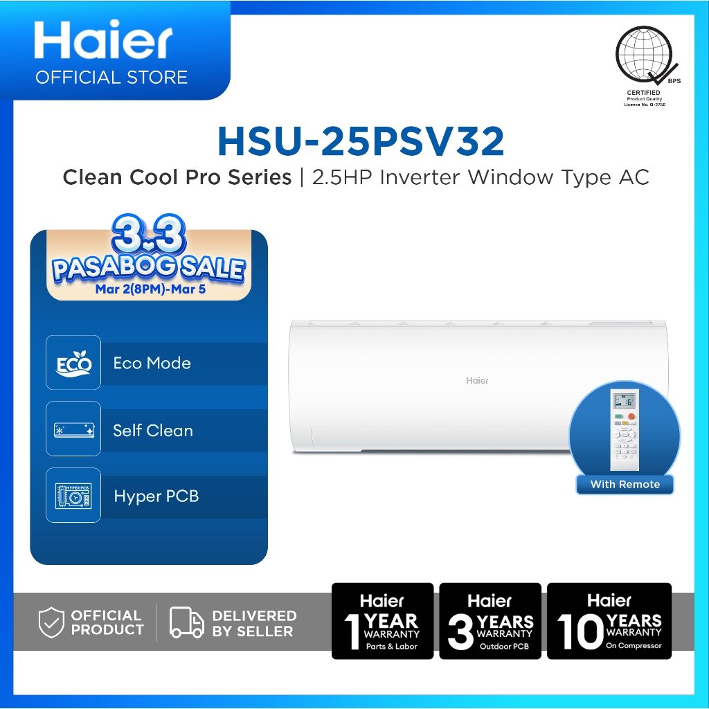 Haier HSU-25PSV32 2.5 HP Clean Cool Plus Inverter Split Type Aircon with Self Clean & Hyper PCB