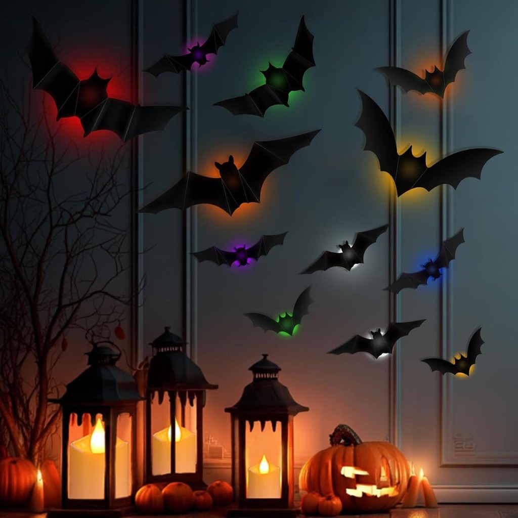 Halloween 3D Glowing Bat, 3D Glowing Spider, LED Decoration, PVC Glowing Bat Sticker, Halloween Glowing Sticker Decoration for Home Bar Party Window (Bats - 12 Pieces)