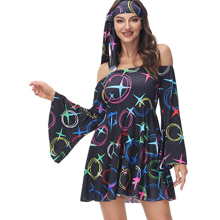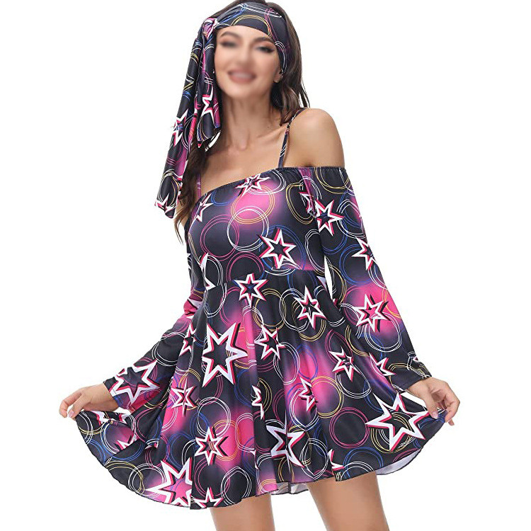 Halloween Retro Hippy Dress Up 70s Disco Dance Costumes Women's Retro Printed Flared Long Sleeve Casual Dresses