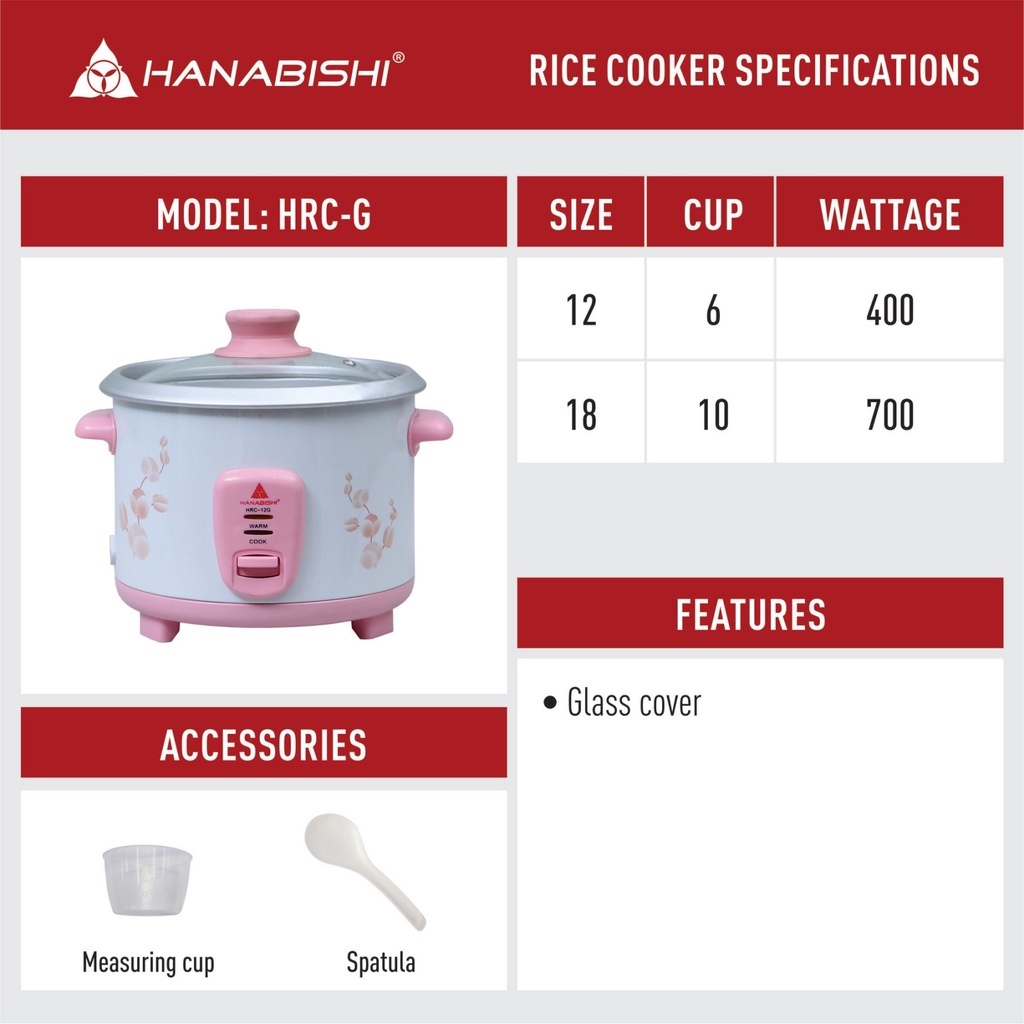 Hanabishi Rice Cooker HRC12G 1.2L Up to 6 serving cups Pink Rice Cooker