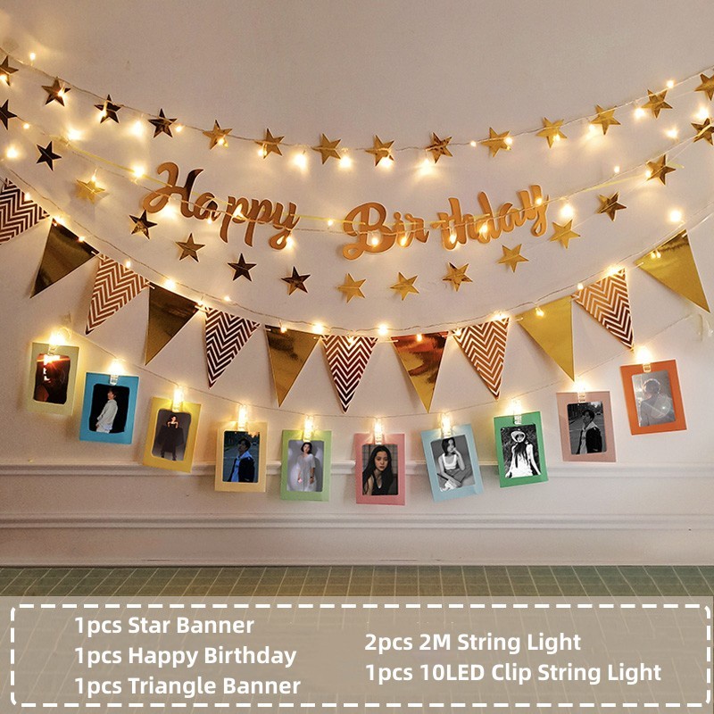 Happy Birthday Banner Flags Set With LED String Light Wall Background Design Christening Decoration